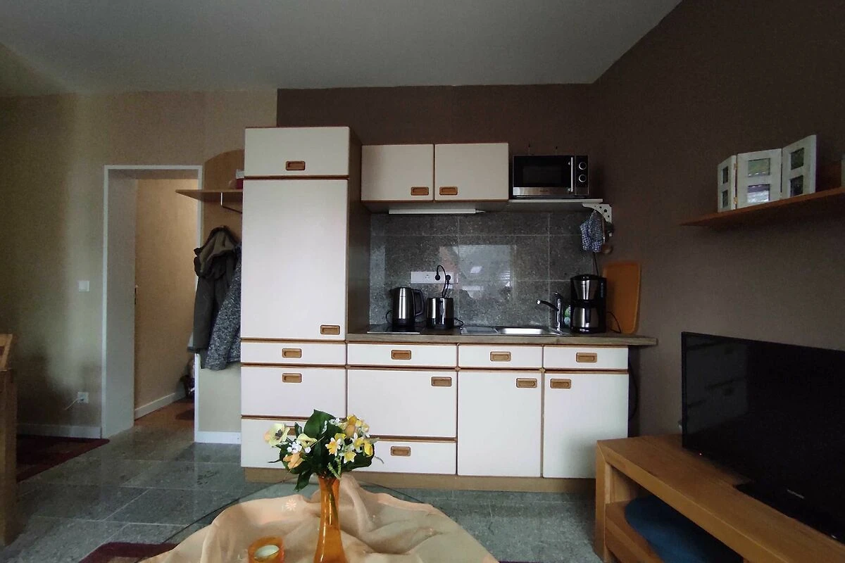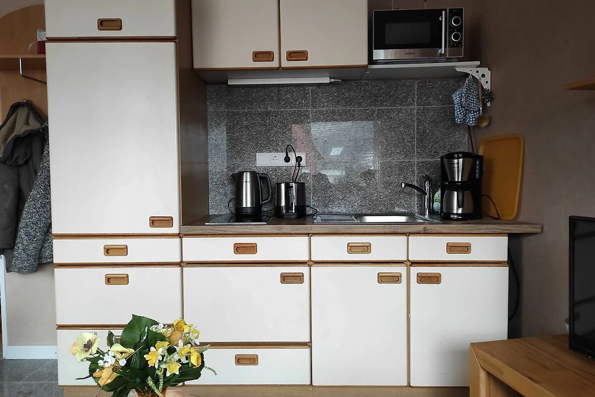 Komplett ausgestattetes Studio-Apartment mit Balkon für 2-3 Personen. Für Allergiker geeignet. Nichtraucherwohnung, auf dem Balkon ist Rauchen gestattet. Es sind 2 Einzelbetten sowie ein Schlafsofa vorhanden. Die Küche ist vollausgestattet mit Mikrowelle, Induktionsfeld, Kühlschrank, Kaffeemaschine, Toaster, Wasserkocher, Töpfe und Pfanne, Geschirr, Besteck, Gläser. Ein Smart-TV mit Sat-Anschluss sowie kostenloses WLAN steht den Gästen zur Verfügung.