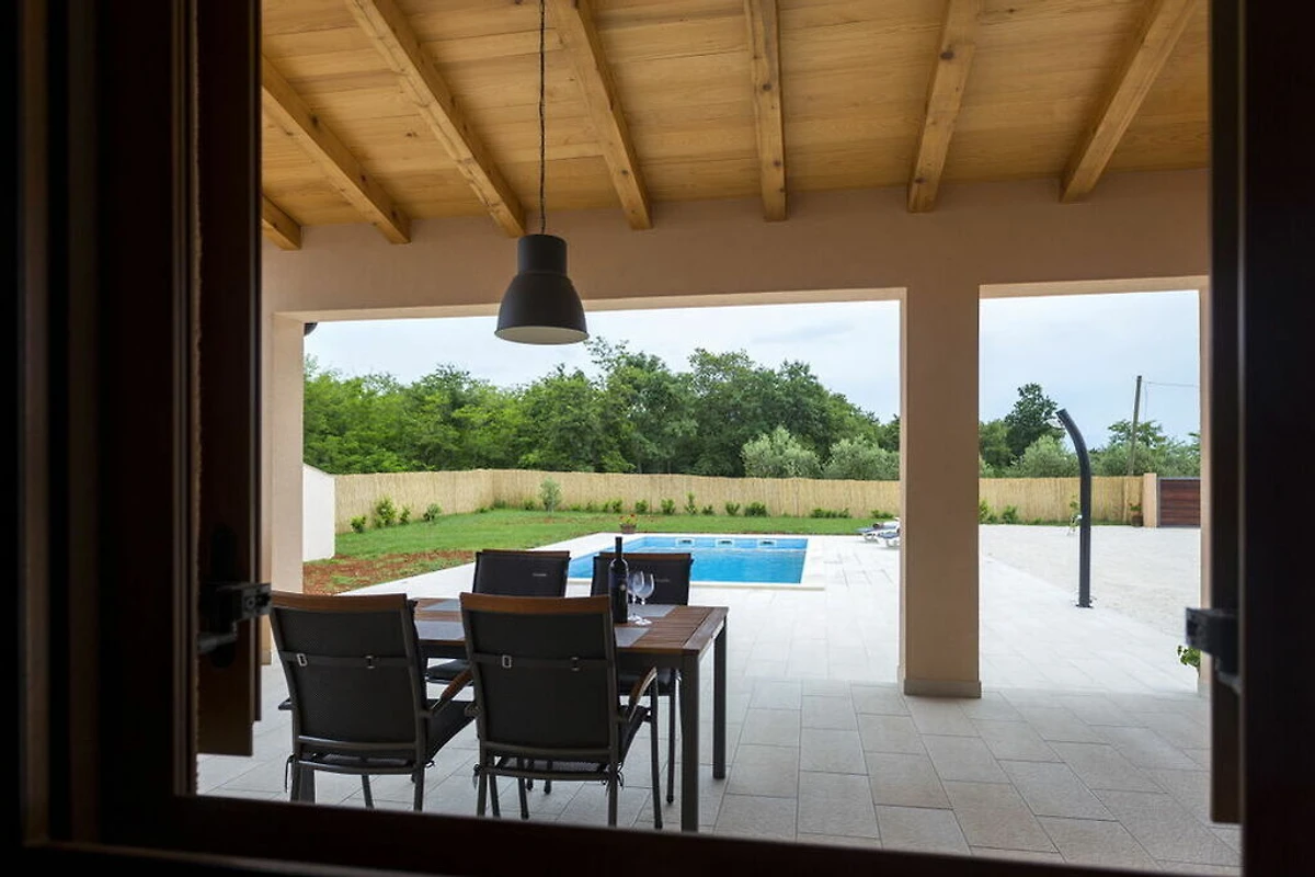 Eine überdachte Terrasse mit Blick auf den großen 8x4-Meter-Pool ist ein großartiger Ort zum Entspannen.