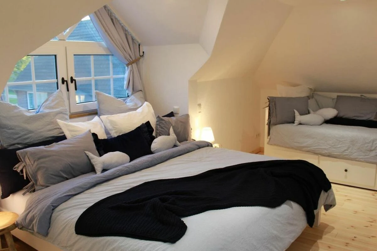 Das offene Wohnkonzept, Bad und Eingangsbereich besitzen eine Fussbodenheizung. Im ostfriesischen Butzenbett könnt Ihr stundelang lesen oder die Seele baumeln lassen. Die ansprechende Küche ist mit edlen Elektrogeräten und diversen Utensilien ausgestattet. Der Essbereich mit original Binsenstühlen und bequemen Esssofa am Gesindetisch kann jederzeit mit einem Kinderhochstuhl ergänzt werden. Im Wohnbereich wartet eine gemütliche Couch und der Ohrensessel gegenüber dem Flachbildfernseher und der Soundanlage mit Deckenlautsprechern. Einen Safe und auch allerlei Unterhaltsames beherbergt der eingebaute Wandschrank. Entspannung bietet im aussergewöhnlichen Bad die begehbare Regendusche. Im offenen und loftartigen Schlafbereich des Obergeschosses erwartet Euch ein heller Dielenholzfussboden. Neben einem grossen und komfortablen Doppelbett, gibt es zwei kuschelige Tagesbetten mit Matratzen, die bei Bedarf zu Doppelbetten ausgezogen werden können. Auf Eurer privaten Terrasse könnt Ihr die Sonne geniessen, den Abend mit einem Glas Wein ausklingen lassen oder Grillen.
