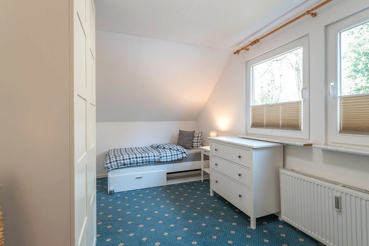 • Zweites Schlafzimmer: Ausgestattet mit zwei Einzelbetten und einem grosszügigen Kleiderschrank ideal für Kinder oder weitere Mitreisende.