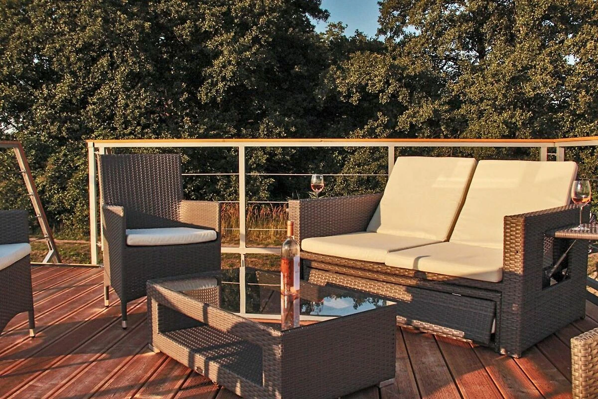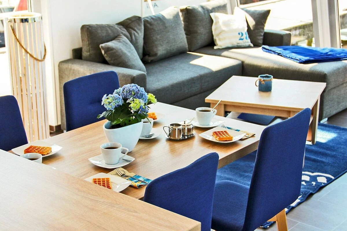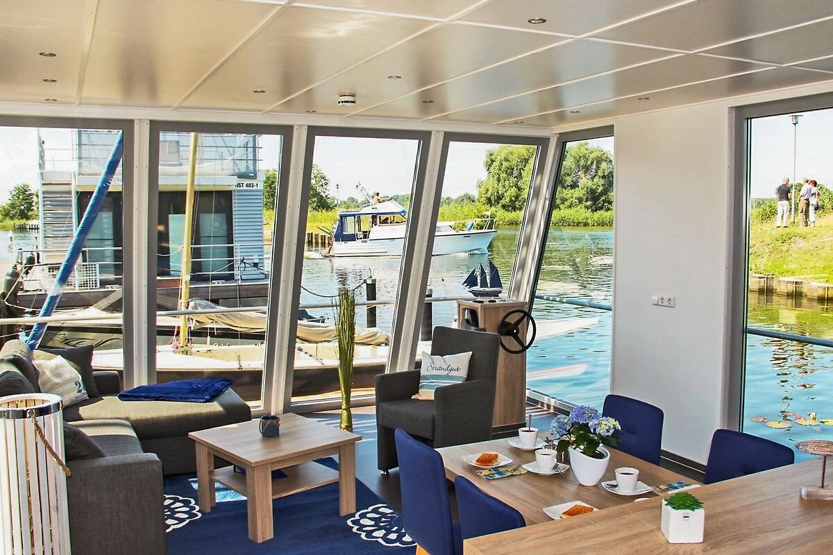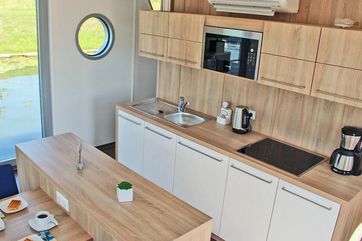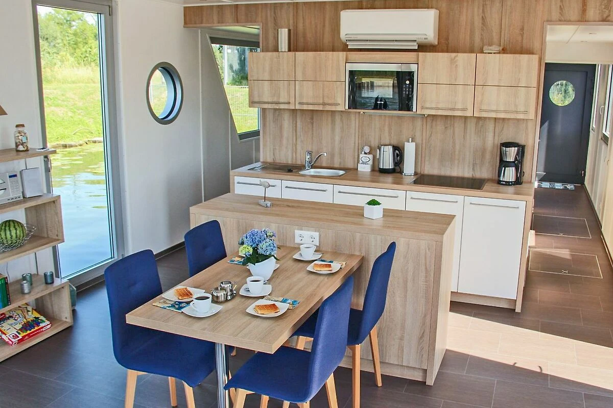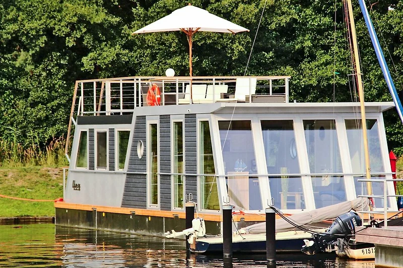 Floating House Xenia liegt ruhig am Rand der Marina Ueckermünde mit direktem Blick auf das Wasser und nur einen kurzen Spaziergang vom feinsandigen Strand entfernt. Das modern und maritim gestaltete Hausboot bietet mit seinen 55m² Wohnfläche und zwei separaten Schlafzimmern Platz für bis zu 3 Personen. Damit ist Xenia ideal für Paare oder kleine Familien, die einen entspannten Urlaub in Wassernähe suchen. Im Inneren erwartet dich ein grosszügiger Wohnbereich mit gemütlicher Eck-Couch, einem Esstisch und einer offen integrierten Küche. Diese ist ausgestattet mit Ceran-Kochfeld (2 Platten), Mikrowelle, Spülmaschine, Kühlschrank, Kaffeemaschine, Toaster, Wasserkocher und allem, was du für die Zubereitung deiner Lieblingsgerichte brauchst. Grosse Fensterfronten lassen viel Licht herein und holen dir das Wasser direkt ins Wohnzimmer. Das Schlafzimmer mit Doppelbett (160x200) sowie ein weiteres mit Einzelbett (90x200) bieten dir ruhige Rückzugsorte mit Wohlfühlatmosphäre. Die komfortable Regen-Dusche und das separate WC mit Waschbecken sorgen für den täglichen Komfort. Als besonderes Highlight erwartet dich an Bord eine Infrarot-Wärmekabine für zwei Personen perfekt für entspannte Stunden, wenn draussen mal eine frische Brise weht. Noch mehr Urlaubsgefühl schenkt dir die grosszügig möblierte Dachterrasse. Ausgestattet mit Sofa, Sesseln, Liege und Sonnenschirm ist sie dein privater Lieblingsplatz zum Sonnenbaden, Lesen oder einfach zum Schiffe-Gucken. Selbstverständlich steht dir auch ein kostenfreier Parkplatz am Hafen zur Verfügung. An Bord findest du ausserdem Sat-TV, Radio und CD-Player und eine Klimaanlage mit Heizfunktion. Ein kleiner, gut erzogener Hund ist bei uns herzlich willkommen.Bei den Fotos handelt es sich um Beispielfotos, die Ausstattung kann abweichen.