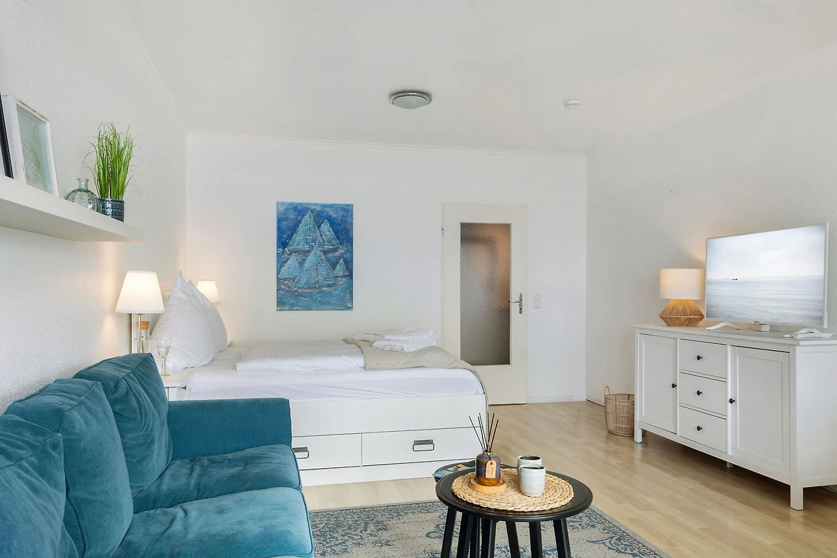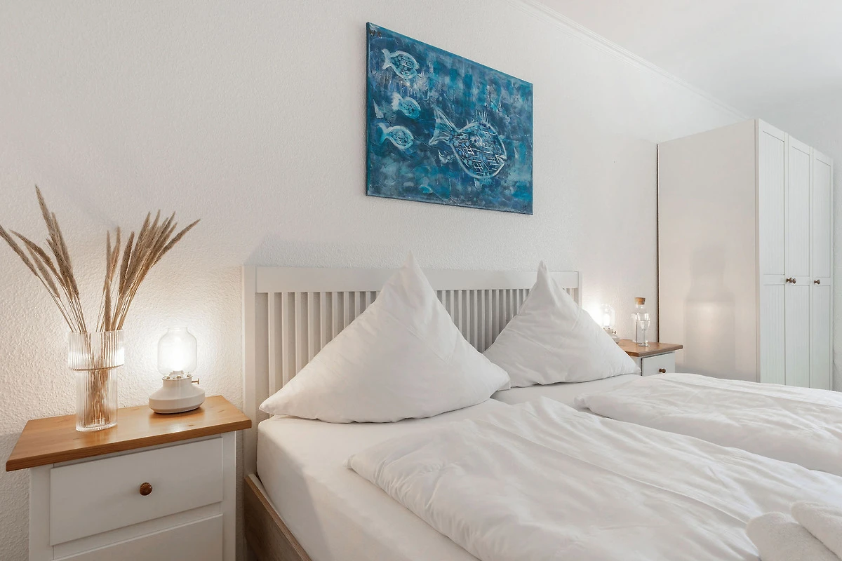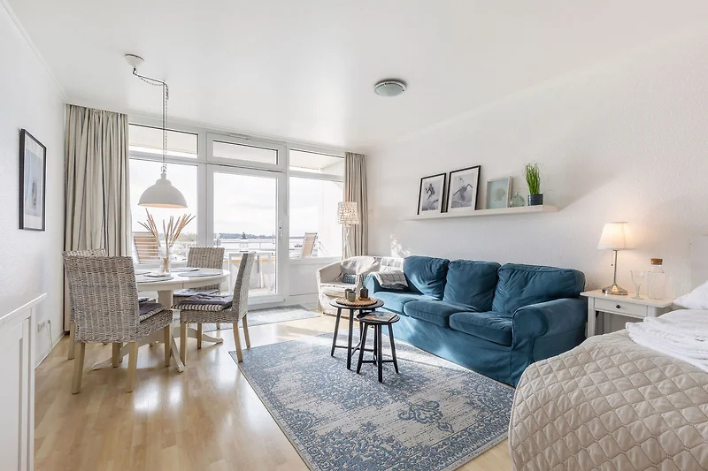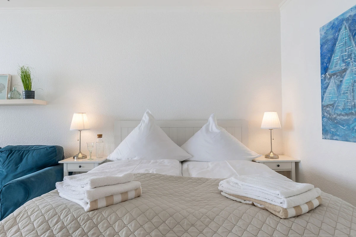 Traumhafter Blick auf Ostsee und Hafeneinfahrt - Verbringen Sie Ihren Urlaub in Cozy Beach, der besonderen Ferienwohnung zwischen Strand und Yachthafen! Das 49 qm grosse Apartment besticht durch den sensationellen Ausblick, direkt vor dem überdachten Balkon liegt die Hafeneinfahrt in den Yachthafen Burgtiefe und es lässt sich herrlich auf die Ostsee und die einfahrenden Schiffe schauen. Aufgeteilt ist Cozy Beach in eine Küche im Eingangsbereich der Wohnung, die über alle Annehmlichkeiten verfügt. Angrenzend befindet sich das Duschbad. Der grosse kombinierte Wohn-Schlafraum verfügt über ein Doppelbett (160x200 cm), Sofa, Smart-TV und Esstisch für 4 Personen. Im separaten Schlafzimmer befindet sich ein weiteres Doppelbett (180x200 cm) sowie ein Kleiderschrank. Zur Wohnung gehört ein Stellplatz vor dem Haus, es gibt einen Abstellraum für Fahrräder für die Hausgemeinschaft.