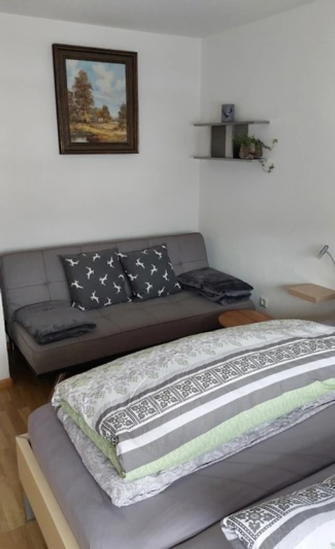 - einem Schlafzimmer mit TV, Doppelbett und Ausziehcouch. Diese kann von einem Kind genutzt werden.
