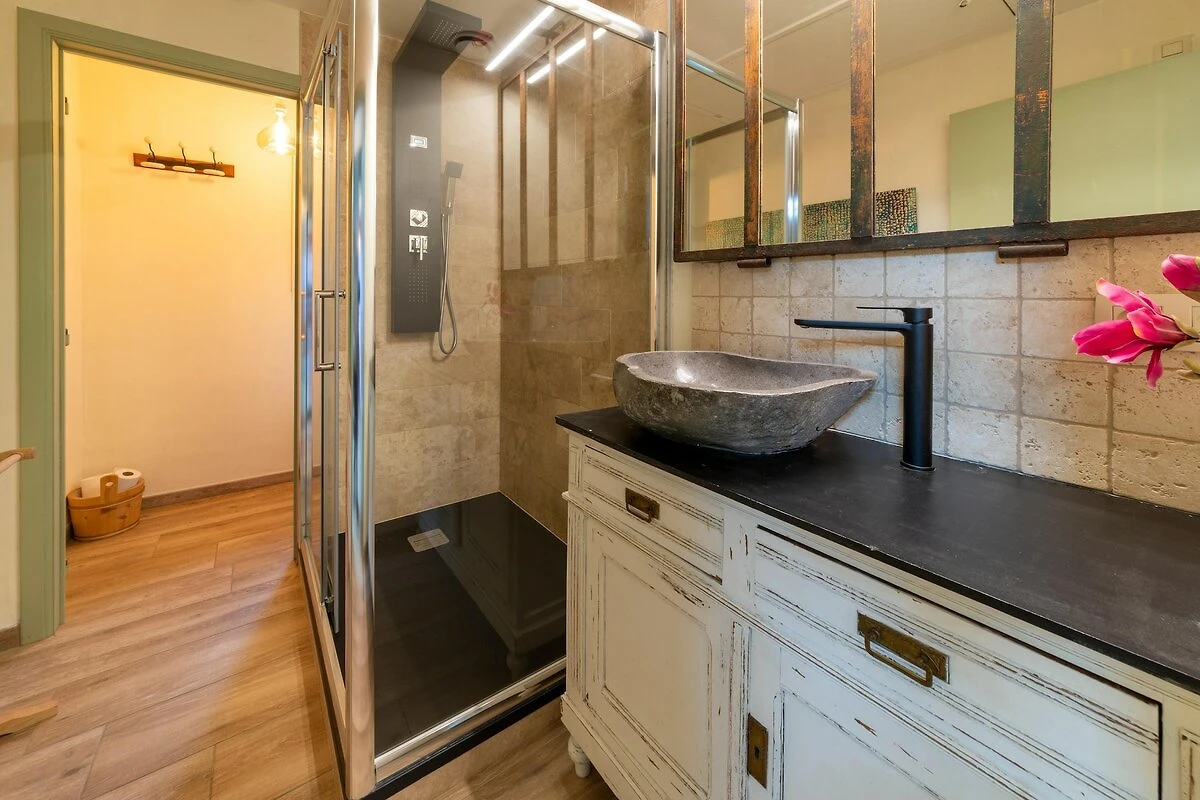 In der 1. Etage: (Schlafzimmer(Doppelbett, TV), Schlafzimmer(Einzelbett, Doppelbett, TV, Balkon oder Terrasse), Schlafzimmer(Doppelbett, TV), Schlafzimmer(Doppelbett, TV), Badezimmer(Dusche, Waschbecken, Toilette, Föhn), Badezimmer(Badewanne, Waschbecken, Waschbecken, Föhn))