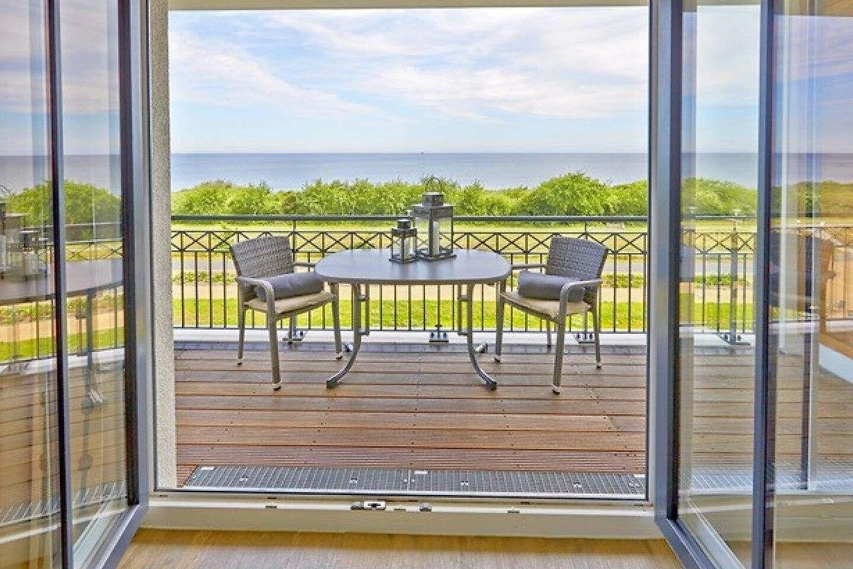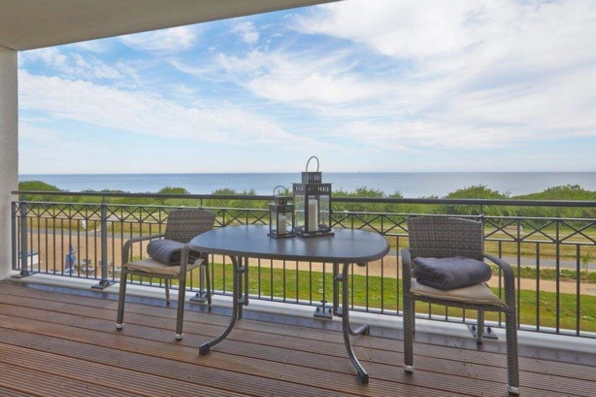 Der überdachte Balkon ist sowohl vom Wohnzimmer als auch vom Schlafzimmer aus begehbar. Natürlich stehen Ihnen hier auch Terrassenmöbel zur Verfügung, sodass Sie beispielweise Ihr Frühstück oder Ihr Abendessen ganz privat im Sonnenschein zu sich nehmen können. Die Waterkant Suites liegen an der Promenade in Börgerende und somit direkt am Meer.