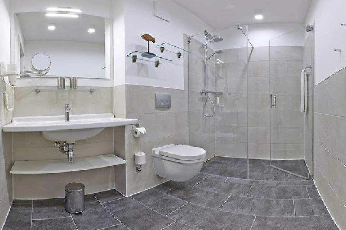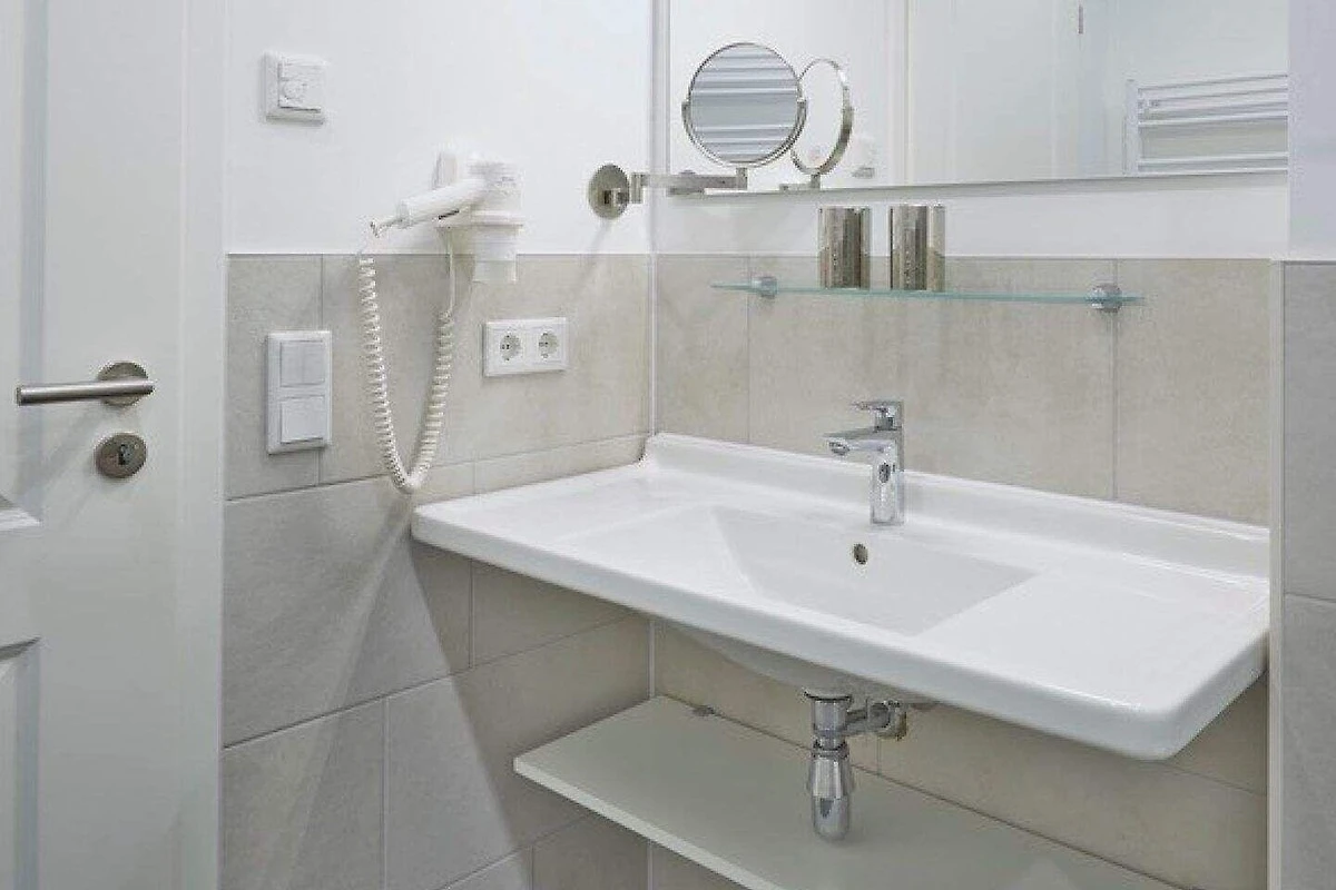 Die offene Regendusche ist das Highlight der Wohnung. Das Badezimmer ist ausgestattet mit einem Handtuchwärmer, einem Waschtisch mit Kosmetikspiegel und einem Haartrockner.