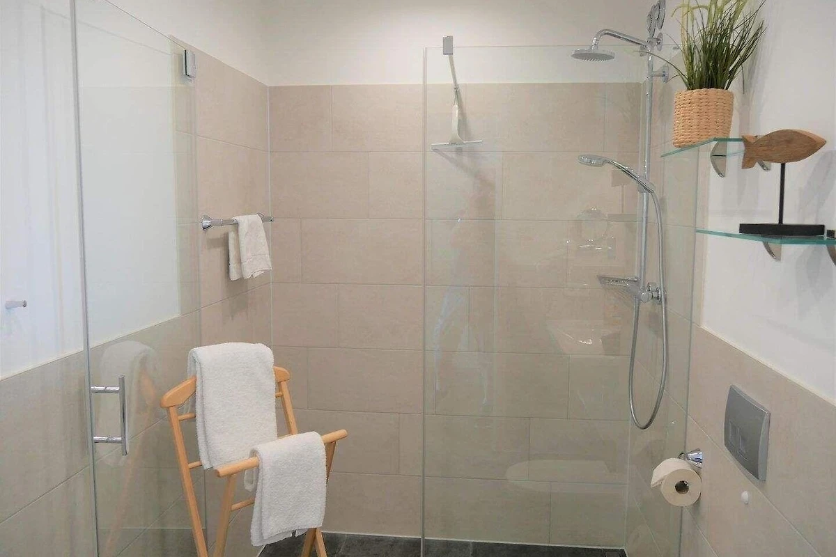 Die offene Regendusche ist das Highlight der Wohnung. Das Badezimmer ist ausgestattet mit einem Handtuchwärmer, einem Waschtisch mit Kosmetikspiegel und einem Haartrockner.