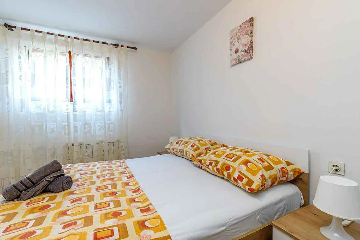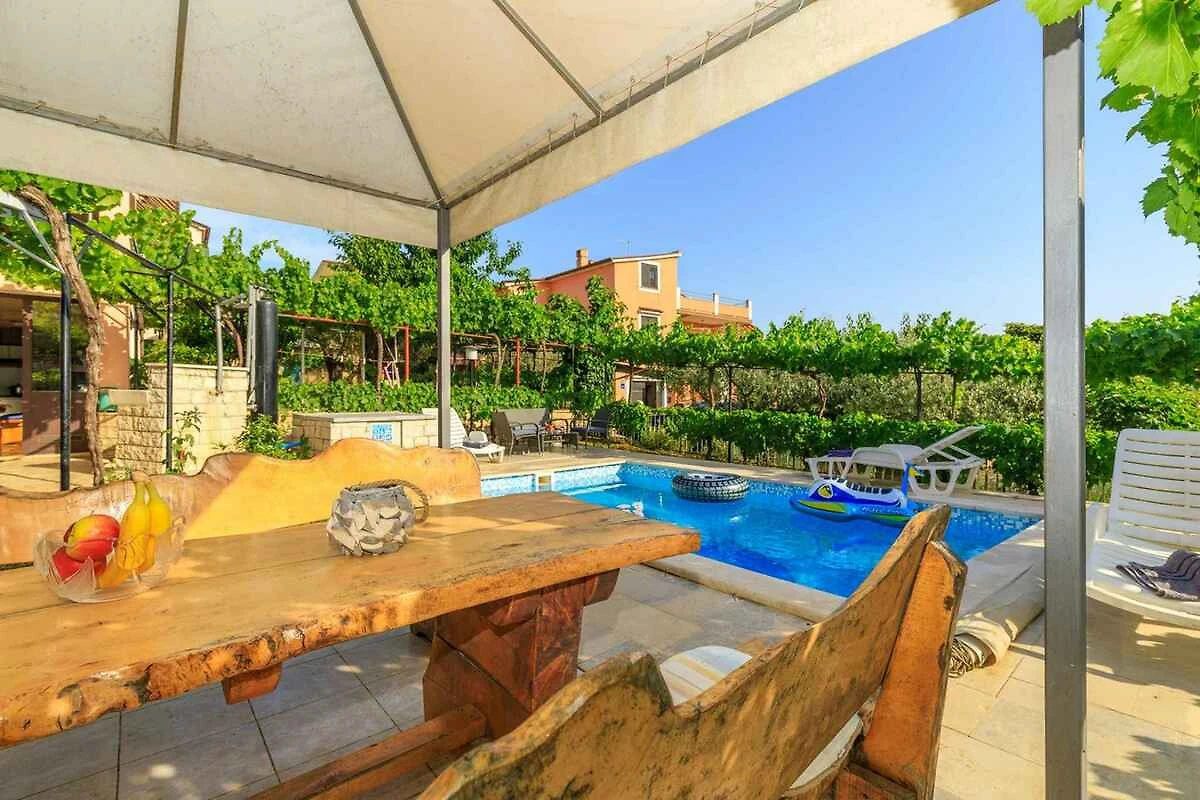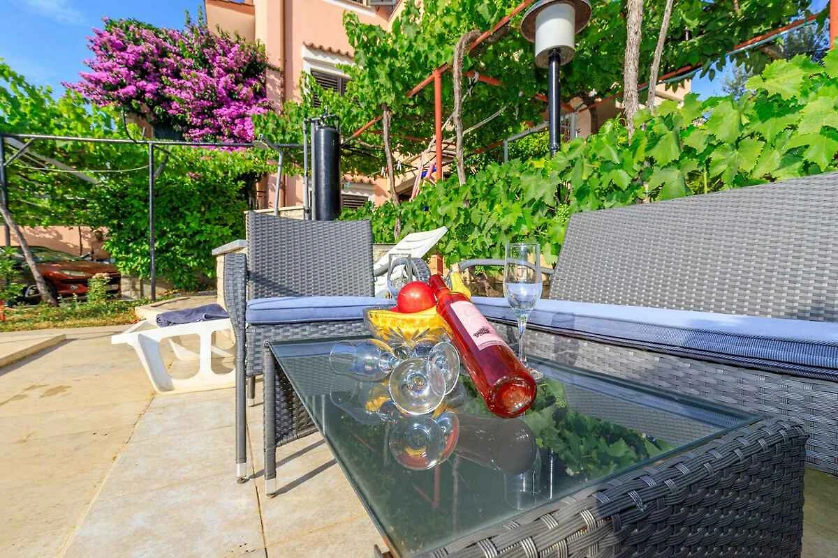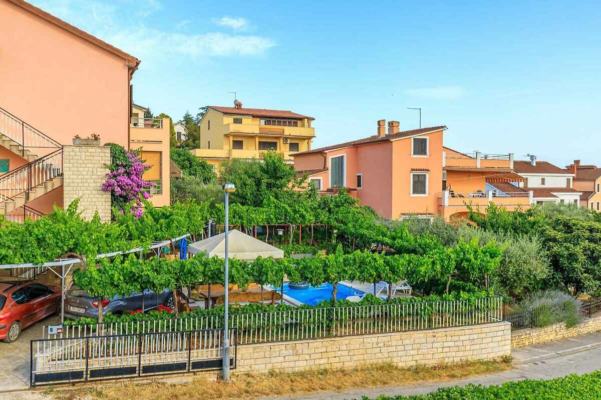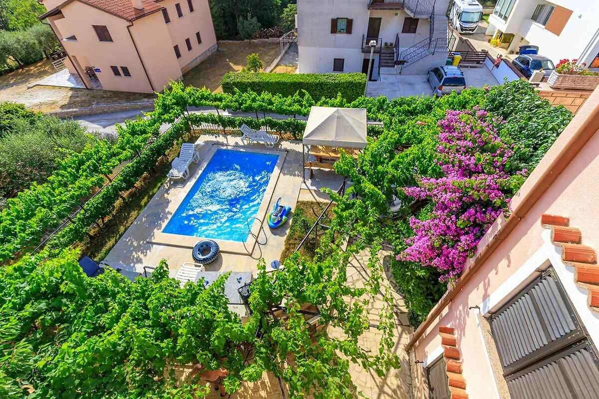 Pula. Die Ferienwohnung befindet sich auf einem geschlossenen Gartengrundstück mit Wiese und Bäumen, von einem Zaun begrenzt. Die Zufahrt erfolgt über eine Nebenstrasse (asphaltiert). Parkplatz auf dem Grundstück.