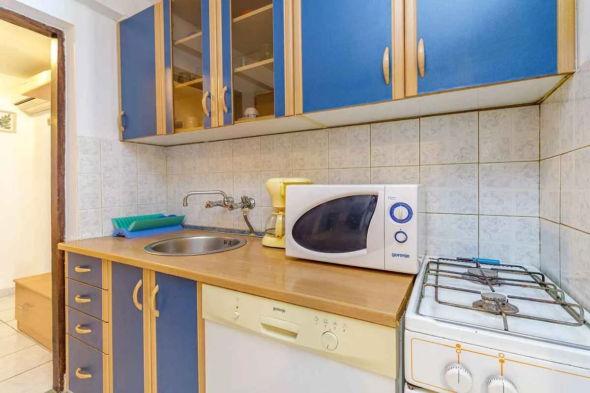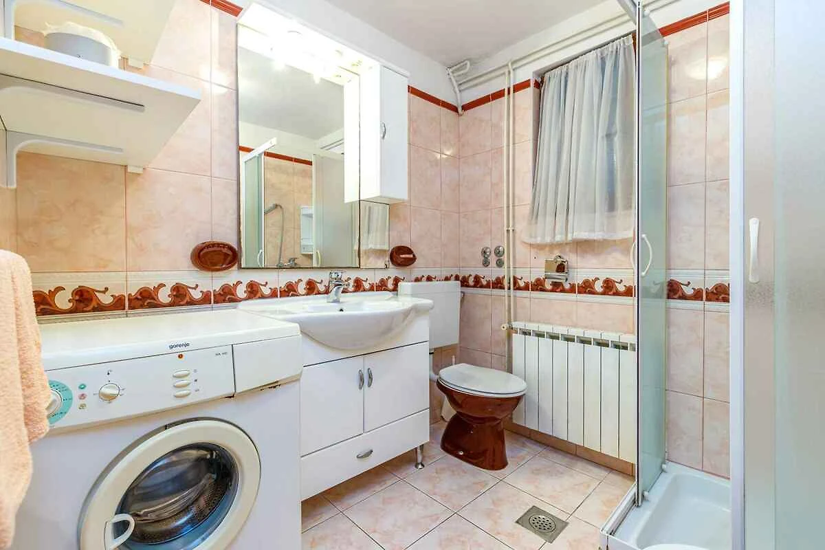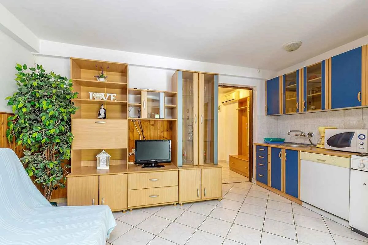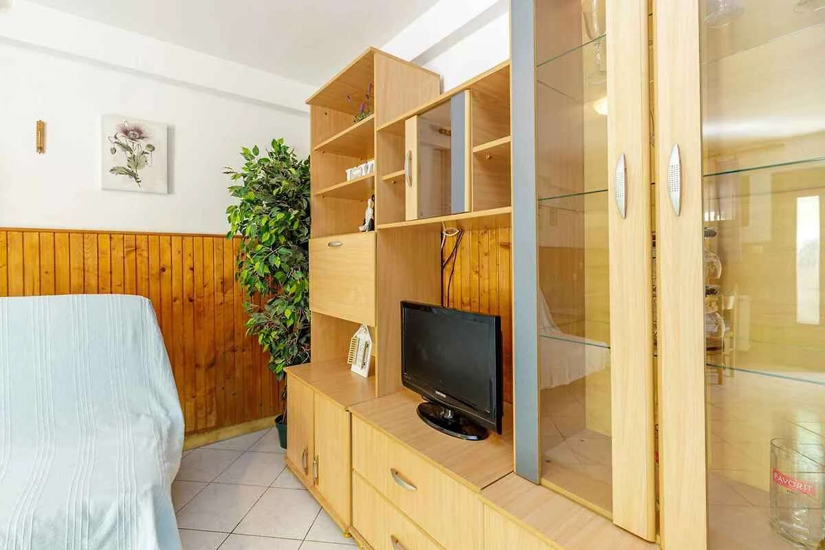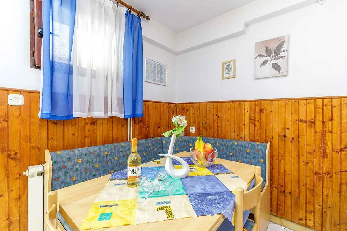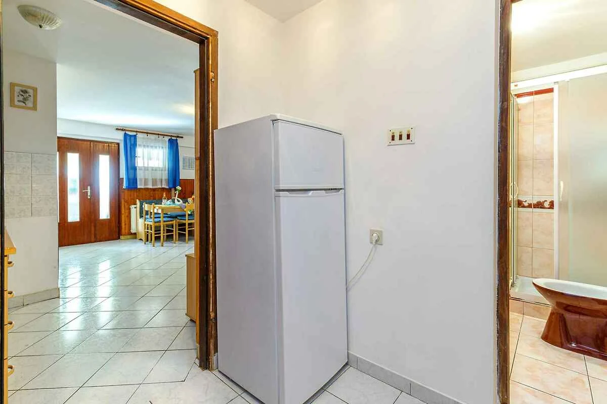Pula. Die Ferienwohnung befindet sich auf einem geschlossenen Gartengrundstück mit Wiese und Bäumen, von einem Zaun begrenzt. Die Zufahrt erfolgt über eine Nebenstrasse (asphaltiert). Parkplatz auf dem Grundstück.