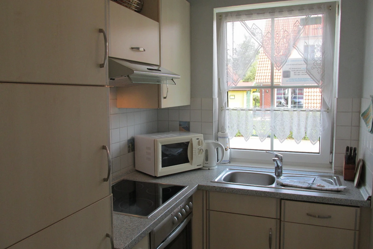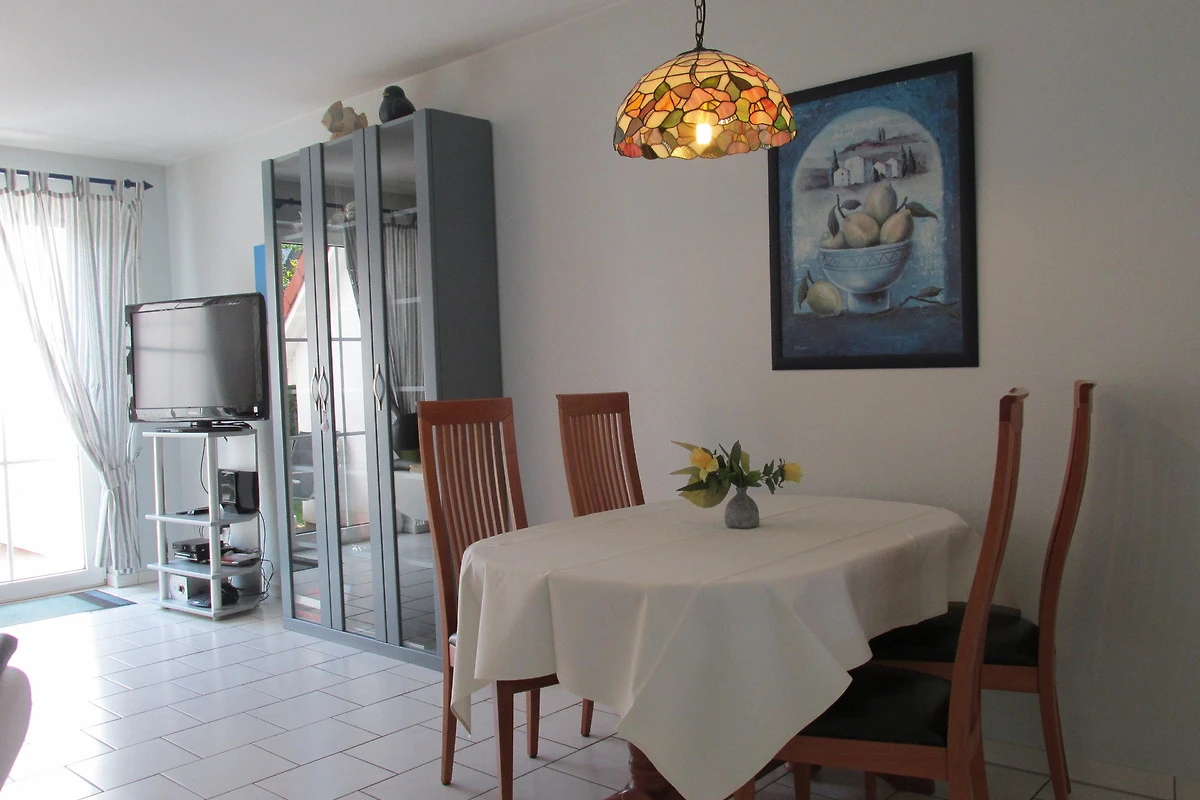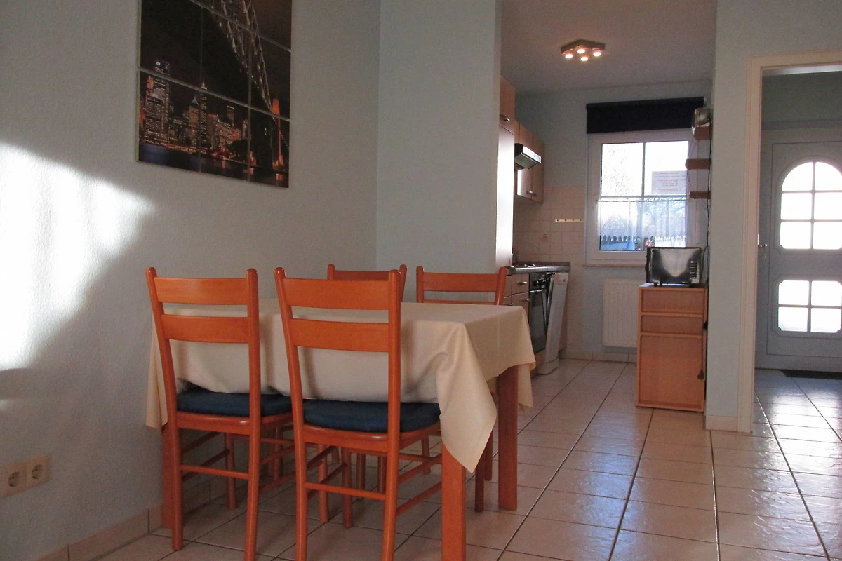 Der Wohnraum mit Essecke, Couchgarnitur & Flachbildfernseher, sowie die Küche mit Geschirrspüler sind im Erdgeschoss.