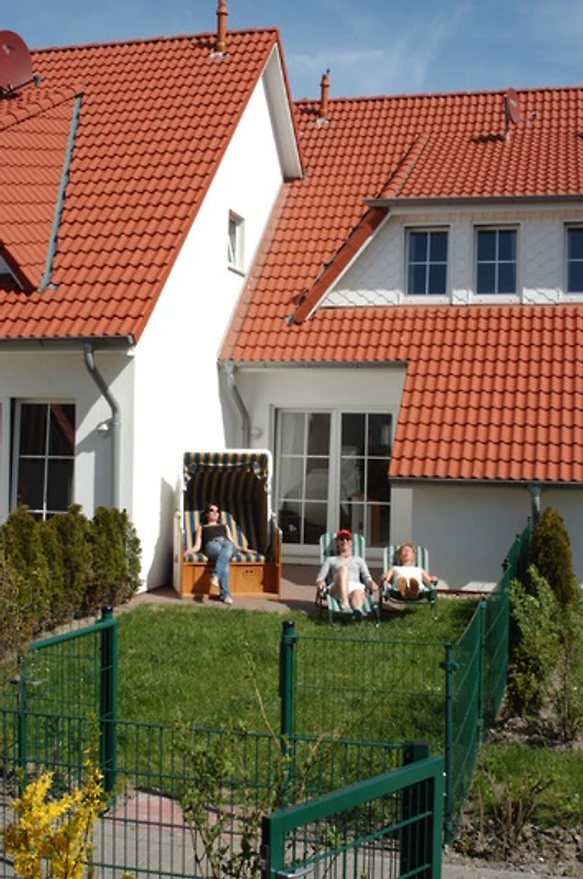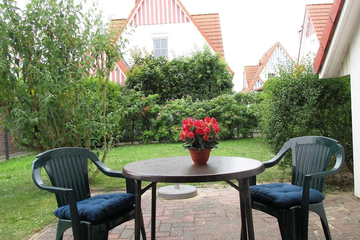 Der Garten hat einen Gartenzaun, Terrasse mit Gartenmöbel für gemütliche Sommerabende.