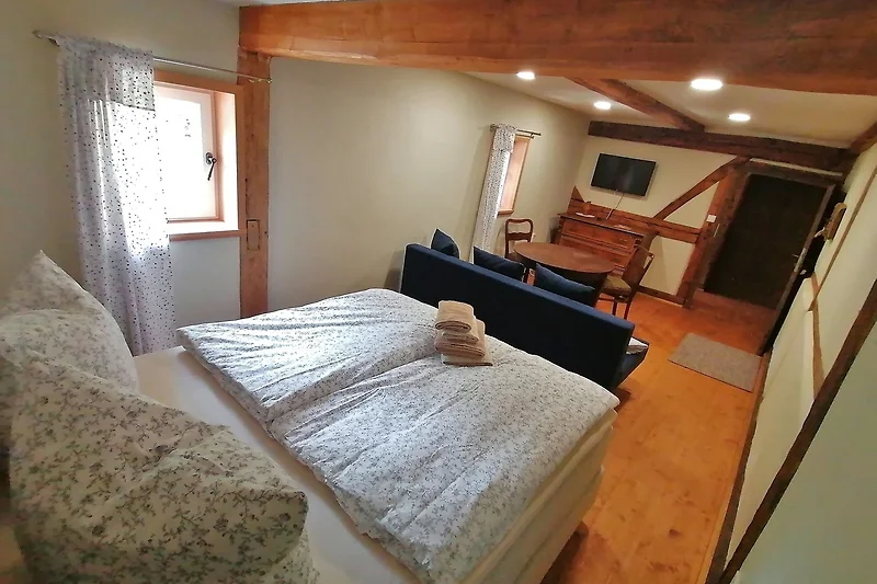 In dem Ferienzimmer ist eine Aufbettung auf dem Schlafsofa für eine Person möglich.