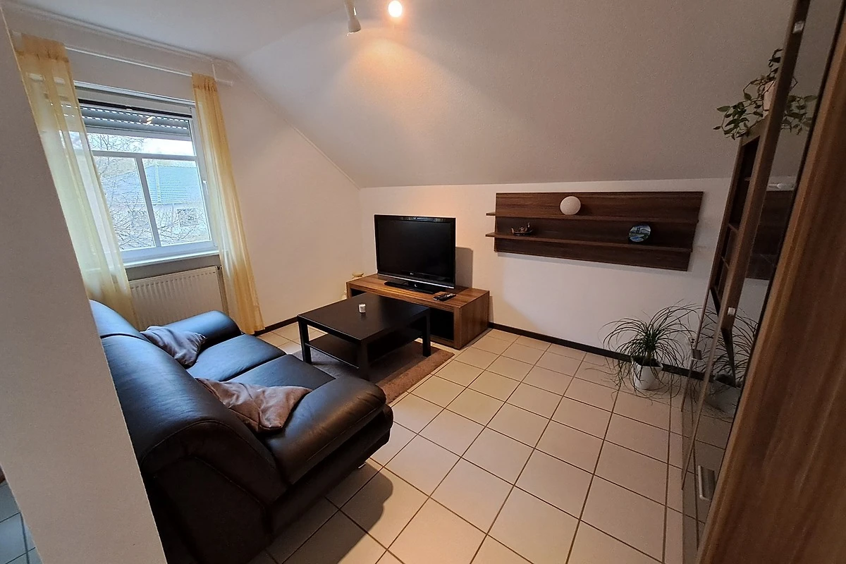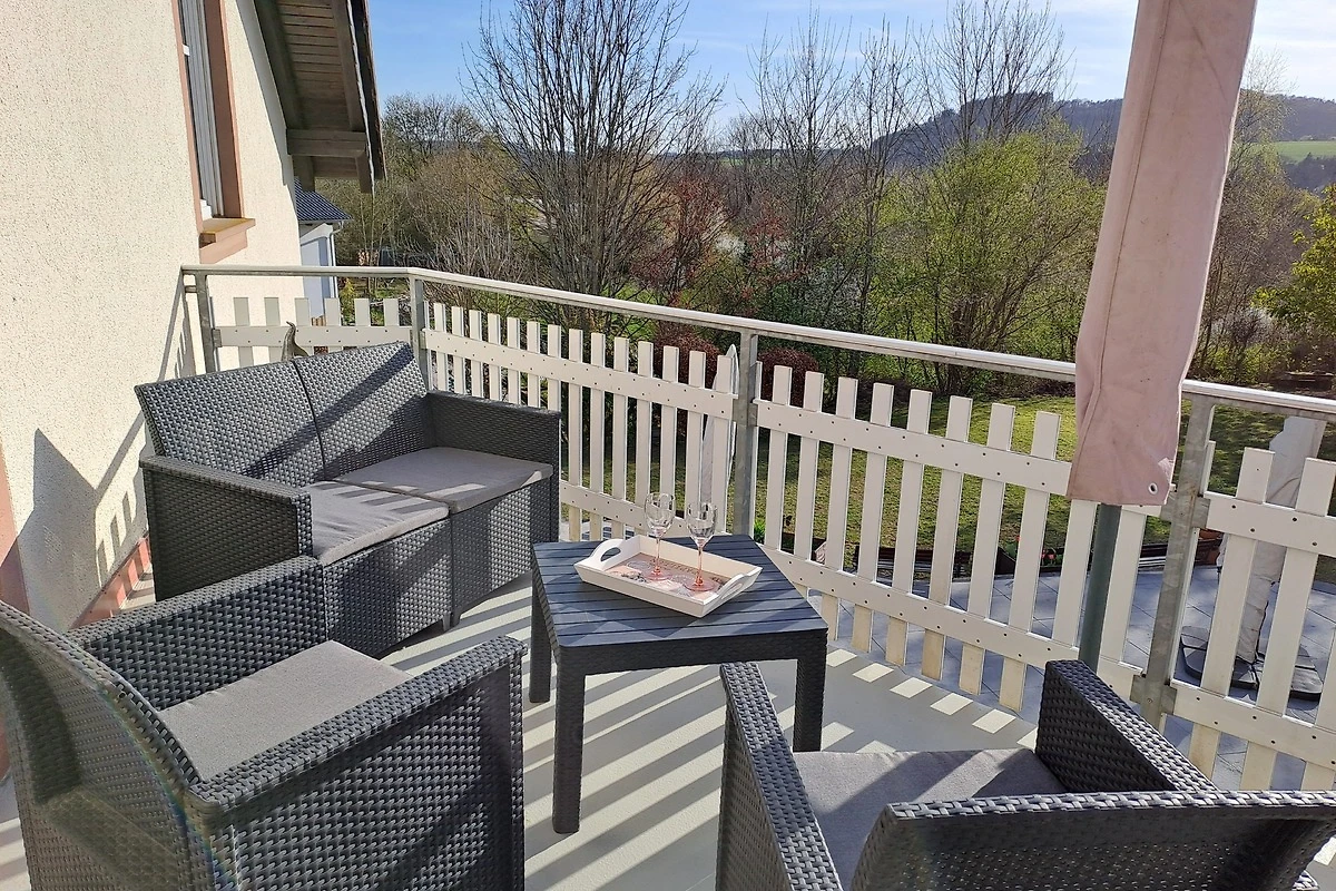 Unsere 60m² Ferienwohnung in 54531 Manderscheid mit Wohnzimmer, Küche, 1 Schlafzimmer mit Doppelbett, Badezimmer, Balkon und separatem Eingang lädt zum Erholen ein.