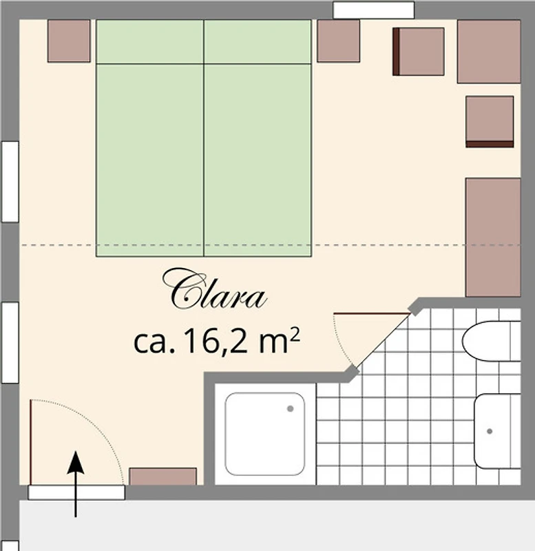 Es verfügt über 3 Fenster, von denen das liegende Dachfenster in westlicher Richtung über den Hof zeigt und 2 Fenster auf der Giebelseite des Hauses, die nach Süden ausgerichtet ist. Das Dachfenster ist mit einer textilen Jalousie versehen. Das Zimmer ist über eine massive Treppe mit 36 Stufen erreichbar, die durchgehend mit einem stabilen Metallgeländer ausgestattet ist. Es ist im ländlichen Stil eingerichtet und verfügt über ein separates Bad mit Du/WC. Zur weiteren Ausstattung gehören ein Sat-TV, ein Beistelltisch mit 2 Stühlen, ein Kleiderschrank und 2 Nachttischschränkchen. Im Bad liegt ein Haartrockner bereit. WLAN steht im Zimmer sowie in der Gaststätte zur Verfügung.