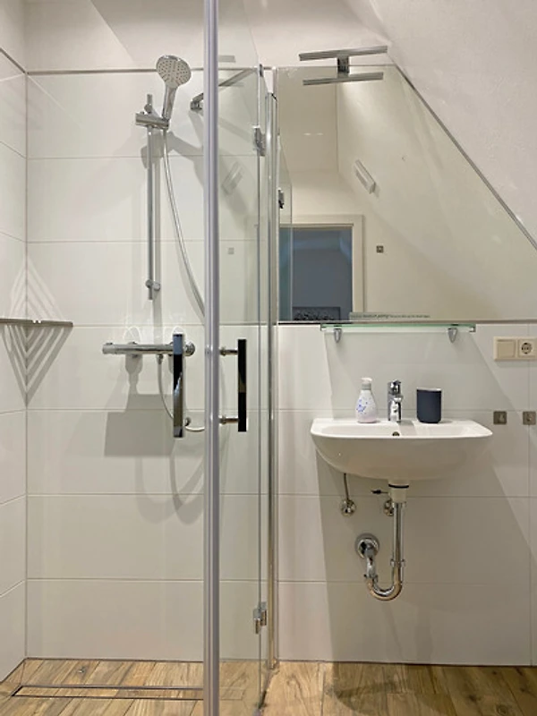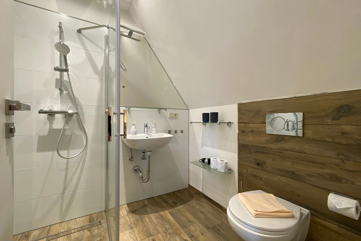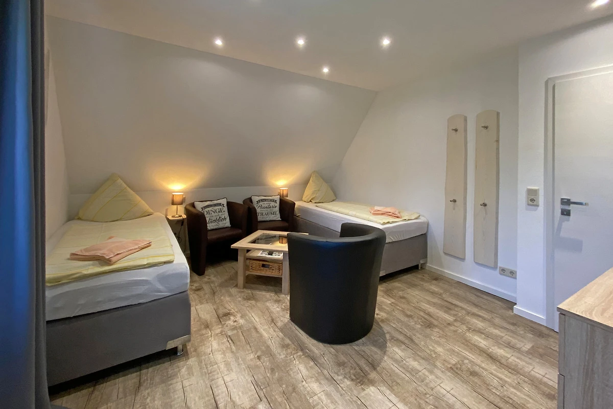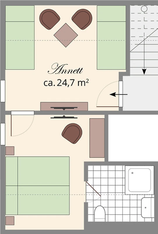 Es ist über eine Holzwendeltreppe mit 16 Stufen und anschliessend über eine weitere, etwas steilere Holztreppe mit 13 Stufen erreichbar, die beide mit einem stabilen Holzhandlauf ausgestattet sind. Im 1. Obergeschoss erwartet Sie ein stilvoll eingerichteter Aufenthaltsraum mit Schreibtisch und Infomaterial. Das Zimmer Annett verfügt über 2 Aufenthalts- und Schlafräume, deren Fenster nach Osten ausgerichtet sind sowie ein separates Badezimmer mit Dusche/WC. Eine leicht gewinkelte Dachschräge verleiht den Räumen eine behagliche Atmosphäre. Beide Zimmer sind durch eine Tür getrennt. Der erste Raum ist mit 2 Einzelbetten, einem Couchtisch mit 2 bequemen Sesseln, einem Sat-TV und einer Kommode ausgestattet. Zur Ausstattung des zweiten Zimmers gehören ein Doppelbett, ein Sat-TV, ein Kleiderschrank mit integriertem Spiegel und ein Sessel. Durch diesen Raum gelangt man in das moderne Bad mit Vollglas-Duschkabine. Dort liegt auch ein Haartrockner bereit. WLAN steht im Zimmer als auch in der Gaststätte zur Verfügung.