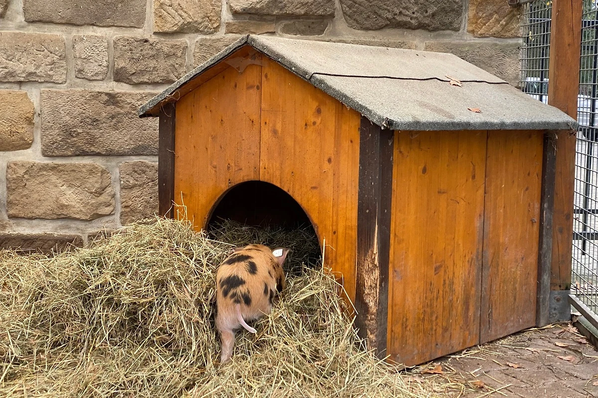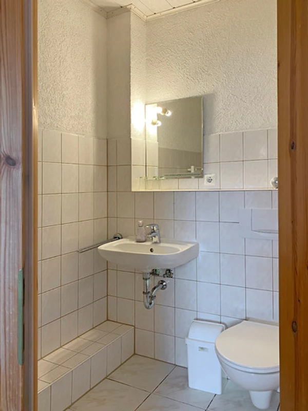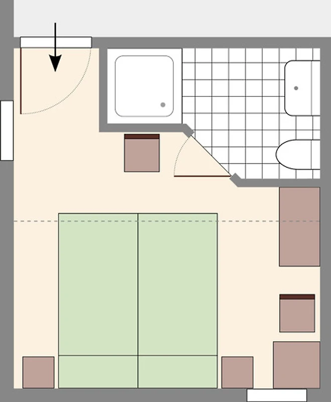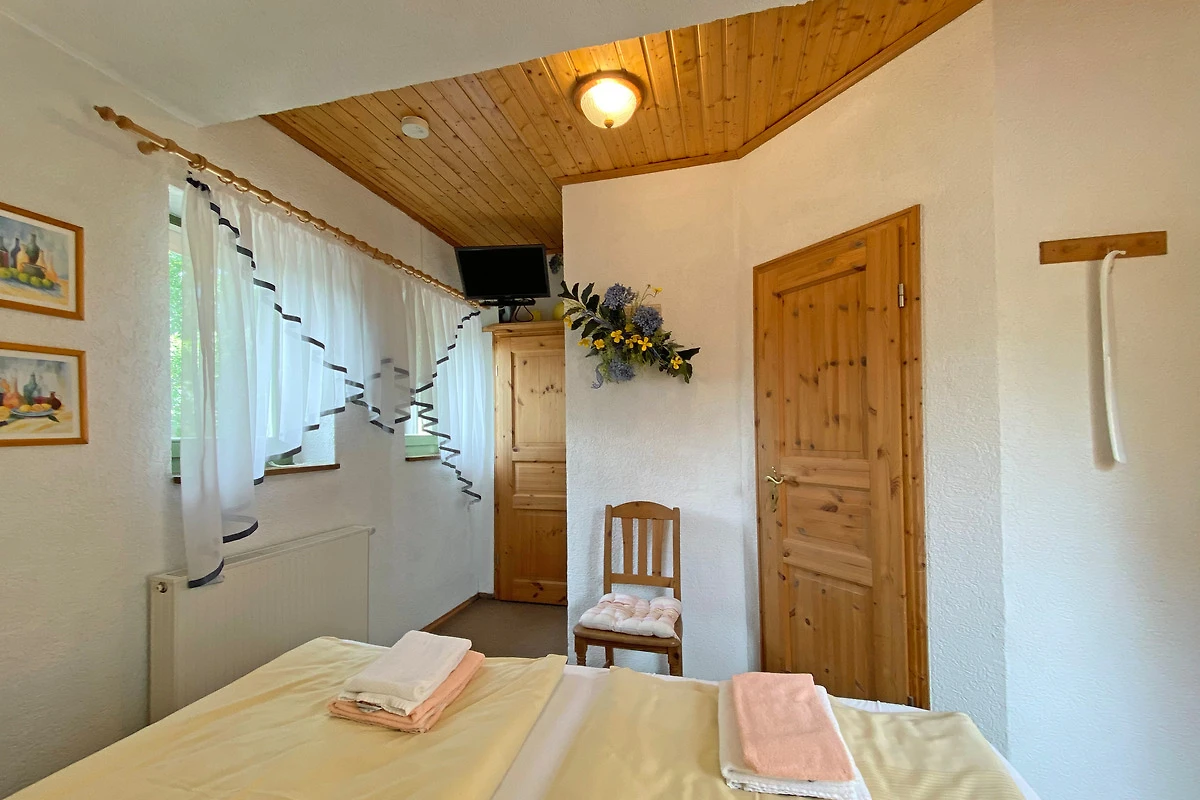 Es verfügt über 2 Fenster, von denen das liegende Dachfenster in östlicher Richtung ausgerichtet ist und das Fenster auf der Giebelseite des Hauses nach Süden zeigt. Das Dachfenster ist mit einer textilen Jalousie versehen. Das Zimmer ist über eine massive Treppe mit 36 Stufen erreichbar, die durchgehend mit einem stabilen Metallgeländer ausgestattet ist. Es ist im ländlichen Stil eingerichtet und verfügt über ein separates Bad mit Du/WC sowie ein Boxspringbett. Zur weiteren Ausstattung gehören ein Sat-TV, ein Beistelltisch, 2 Stühle, ein Kleiderschrank, 2 Nachttischschränkchen und ein Standventilator. Im Bad liegt ein Haartrockner bereit. WLAN steht im Zimmer sowie in der Gaststätte zur Verfügung.