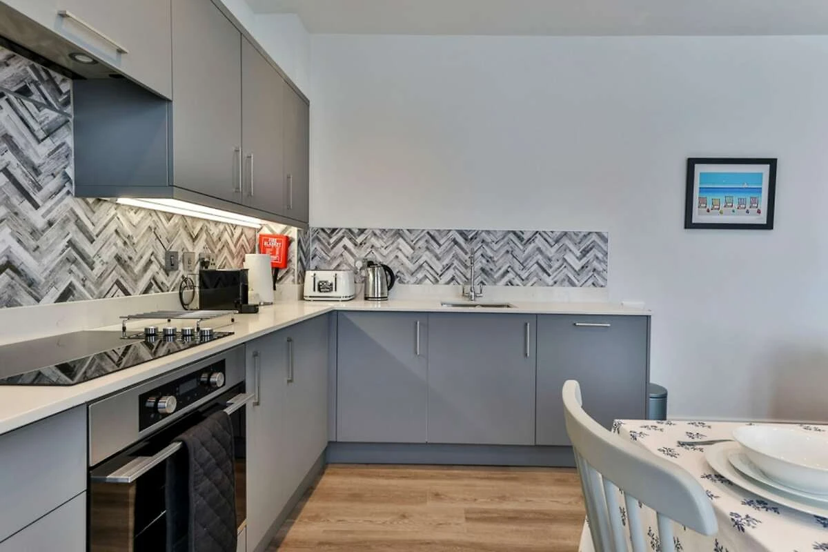 Dieses moderne Ferienhaus ist ein modernes Apartment im zweiten Stock mit hellem, offenem Wohnraum und ideal für Familien oder kleine Gruppen, die einen Urlaub an der Küste verbringen möchten. Mit einem Schlafzimmer mit Kingsize-Bett und einem zweiten Zweibettzimmer, das zu einem Super-Kingsize-Bett umgebaut werden kann, bietet es bequem Platz für vier Personen. Der Wohnbereich ist zum Entspannen in der Gruppe konzipiert und verfügt über ein Sofa, Brettspiele und einen an der Wand montierten Flachbildfernseher. Es stehen kostenfreie, zugewiesene Parkplätze zur Verfügung. Haustiere sind zwar nicht gestattet, die Gäste genießen jedoch einen sauberen, allergenfreien Bereich, der ideal für Familien mit kleinen Kindern oder Personen ist, die empfindlich auf Tierhaare reagieren.