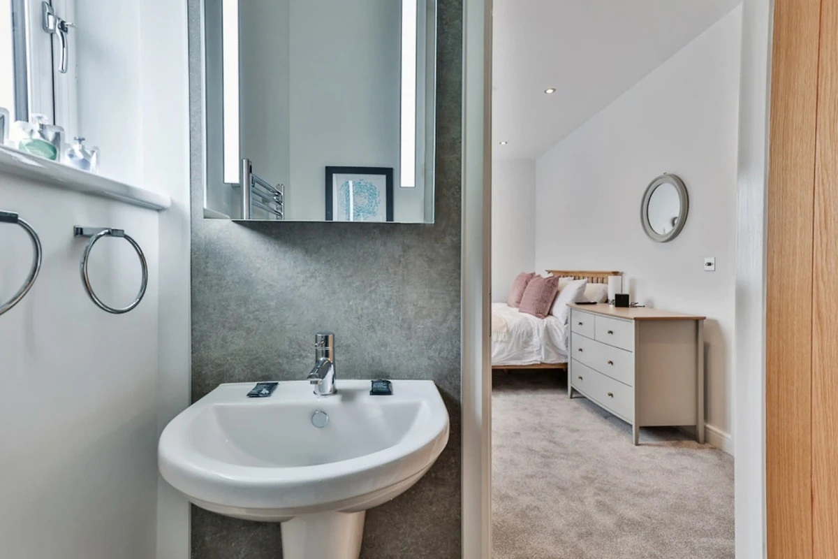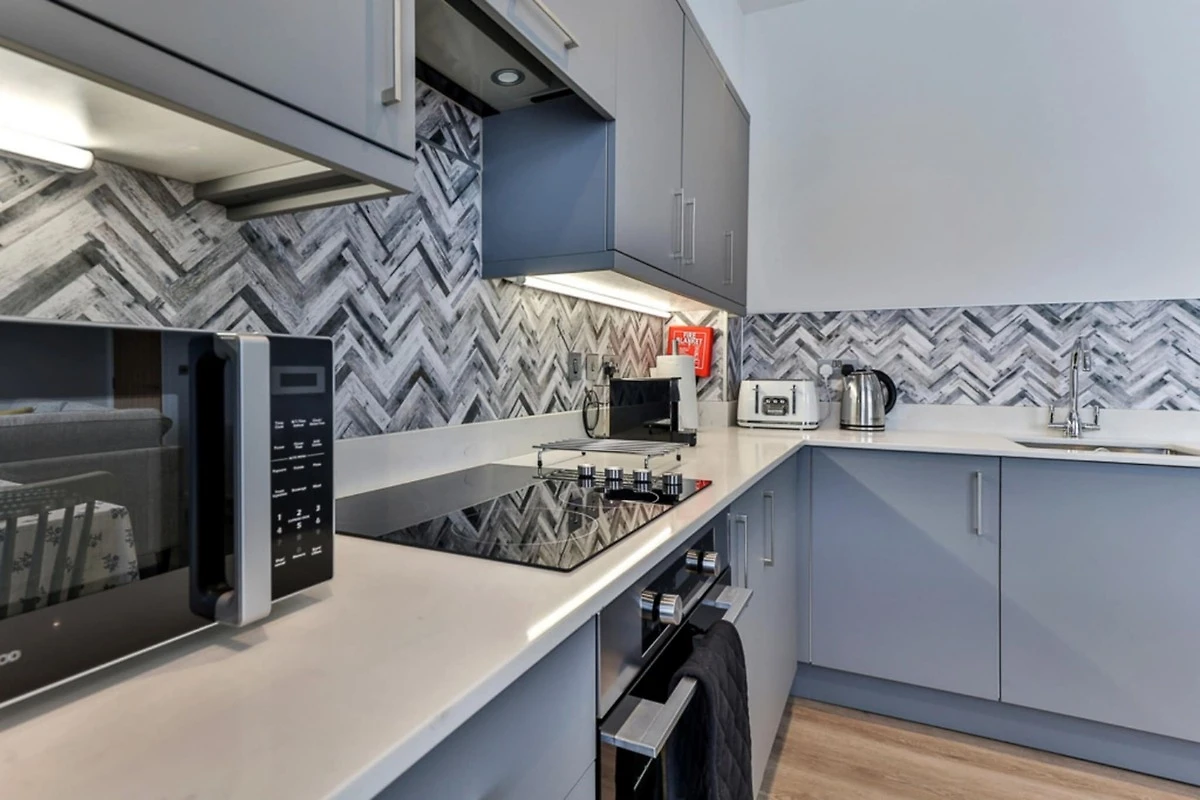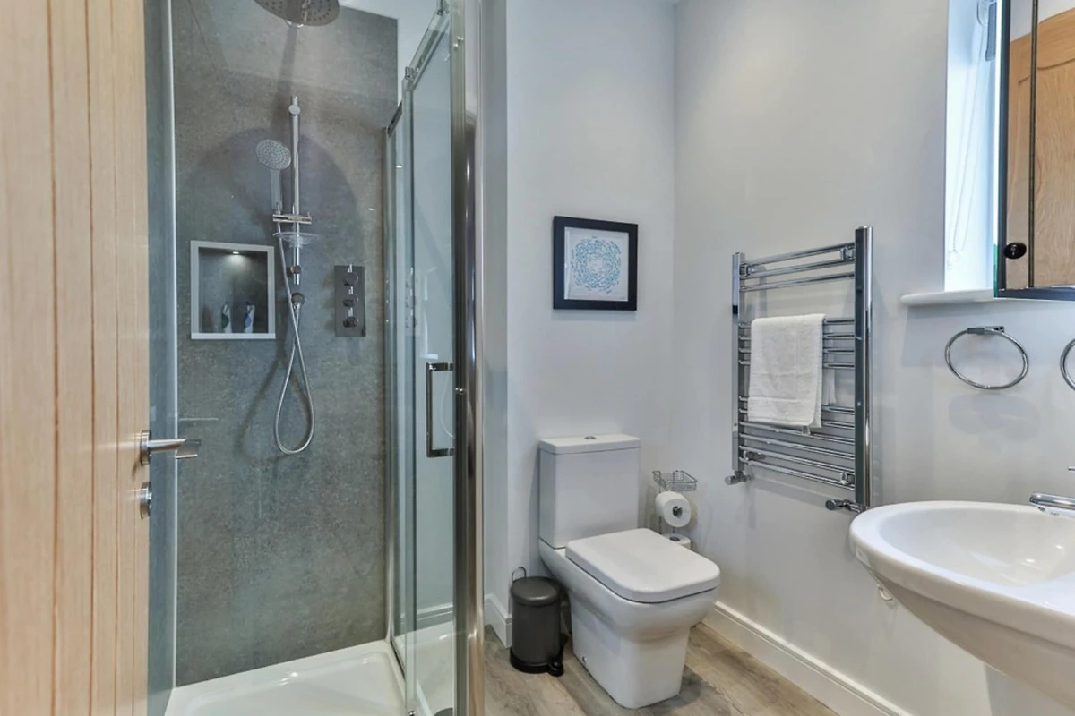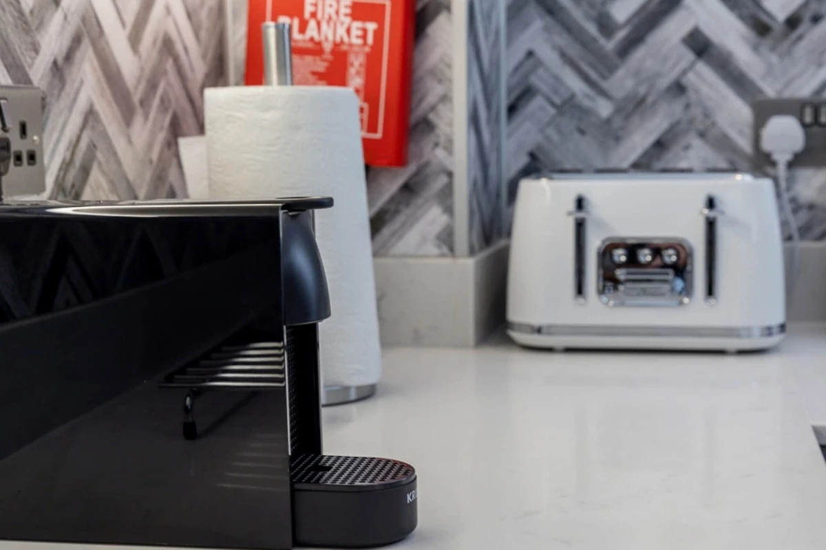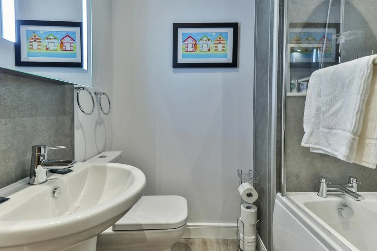 Die voll ausgestattete Küche verfügt über einen kompletten Backofen, ein Kochfeld, eine Mikrowelle, einen Kühl-Gefrierschrank, einen Geschirrspüler, einen Waschtrockner, einen Toaster, einen Wasserkocher und eine Nespresso-Maschine. Das Apartment verfügt über zwei Badezimmer: ein eigenes Badezimmer mit Dusche und ein stilvolles Hauptbadezimmer mit Badewanne, Kopfbrause, beheiztem Handtuchhalter und beleuchtetem Spiegel. Dieses gut ausgestattete Apartment befindet sich im zweiten Stock und ist nur über eine Treppe zugänglich. Es eignet sich perfekt für Gäste, die einen ruhigen und dennoch gut vernetzten Rückzugsort in Filey suchen.