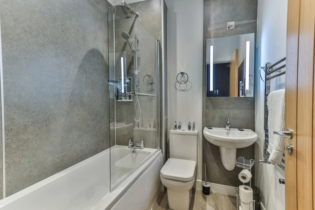 Eine voll ausgestattete Küche bietet modernen Komfort mit Backofen, Herd, Geschirrspüler, Mikrowelle, Kühl-Gefrierkombination, Waschtrockner und Nespresso-Maschine. Das luxuriöse Badezimmer verfügt über eine Badewanne mit Kopfbrause, einen beheizten Handtuchhalter und einen hintergrundbeleuchteten Spiegel für eine gehobene Note. Das Apartment ist nur über eine Treppe mit Handläufen zugänglich und bietet eine komfortable, gut ausgestattete Basis für einen eleganten Aufenthalt an der Küste.