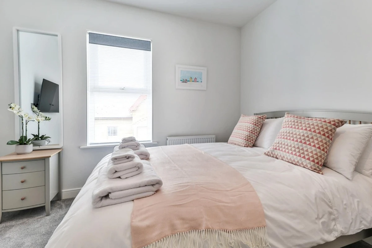 Dieses helle und moderne Ferienhaus ist ein stilvolles Apartment im zweiten Stock und ideal für Paare oder Alleinreisende, die einen ruhigen Rückzugsort an der Küste suchen. Der Raum verfügt über ein großzügiges Schlafzimmer mit Kingsize-Bett, viel Stauraum und einen zweiten an der Wand montierten Fernseher für zusätzlichen Komfort. Ein geräumiger Wohnbereich verfügt über ein gemütliches Sofa, einen Flachbildfernseher und Brettspiele für ruhige Abende. Die Unterkunft bietet Platz für zwei Personen und erlaubt keine Haustiere, sodass eine ruhige, allergenfreie Umgebung herrscht. Kostenlose Parkplätze im Freien sind im Preis inbegriffen und Grundausstattung wie Handtücher, Bettwäsche und Heizung sind ohne Aufpreis erhältlich.