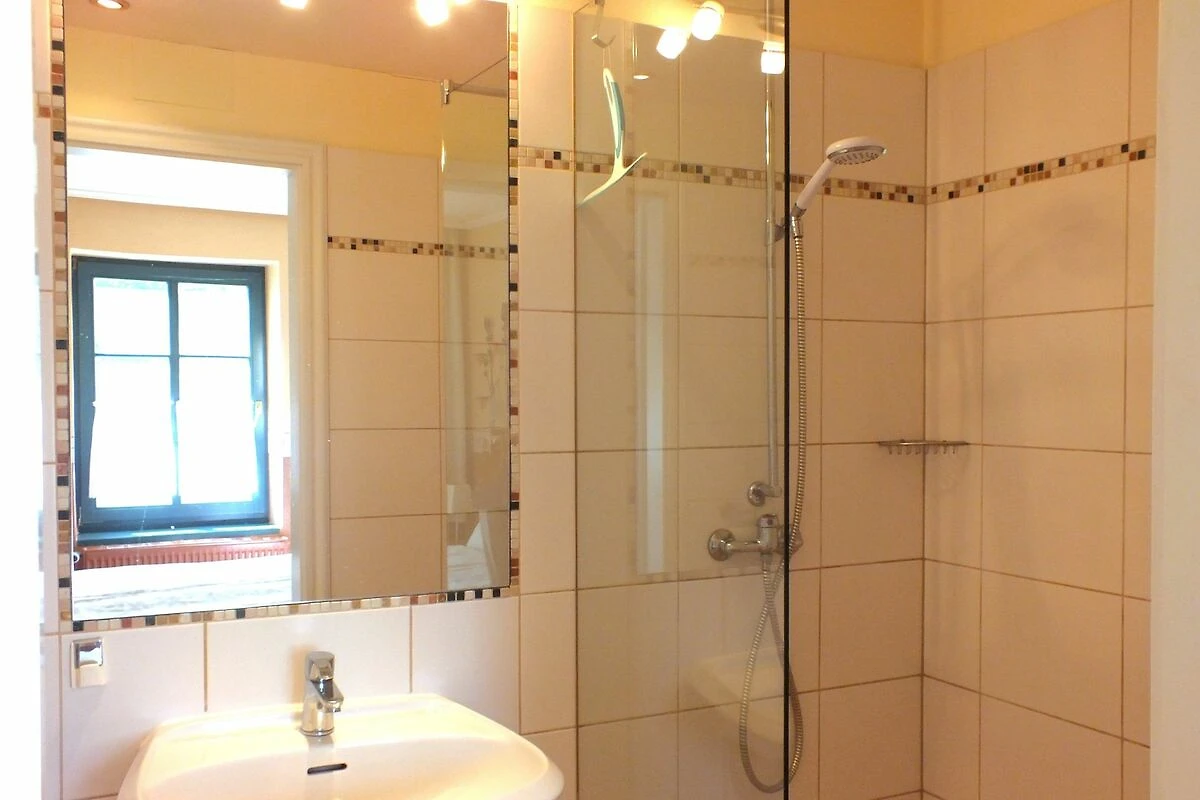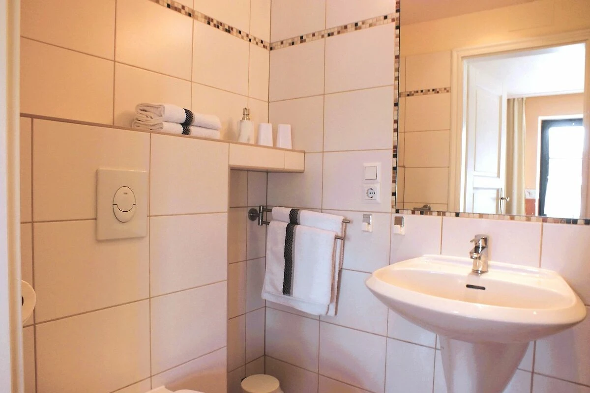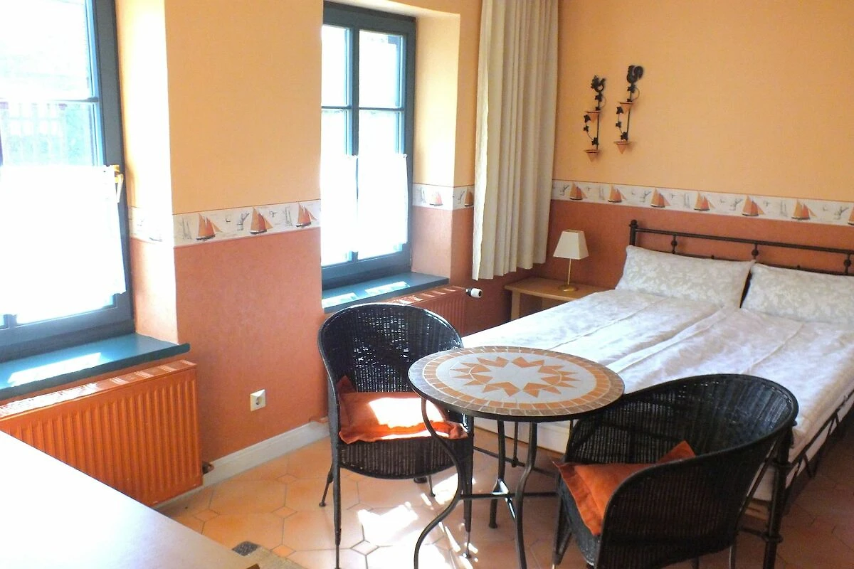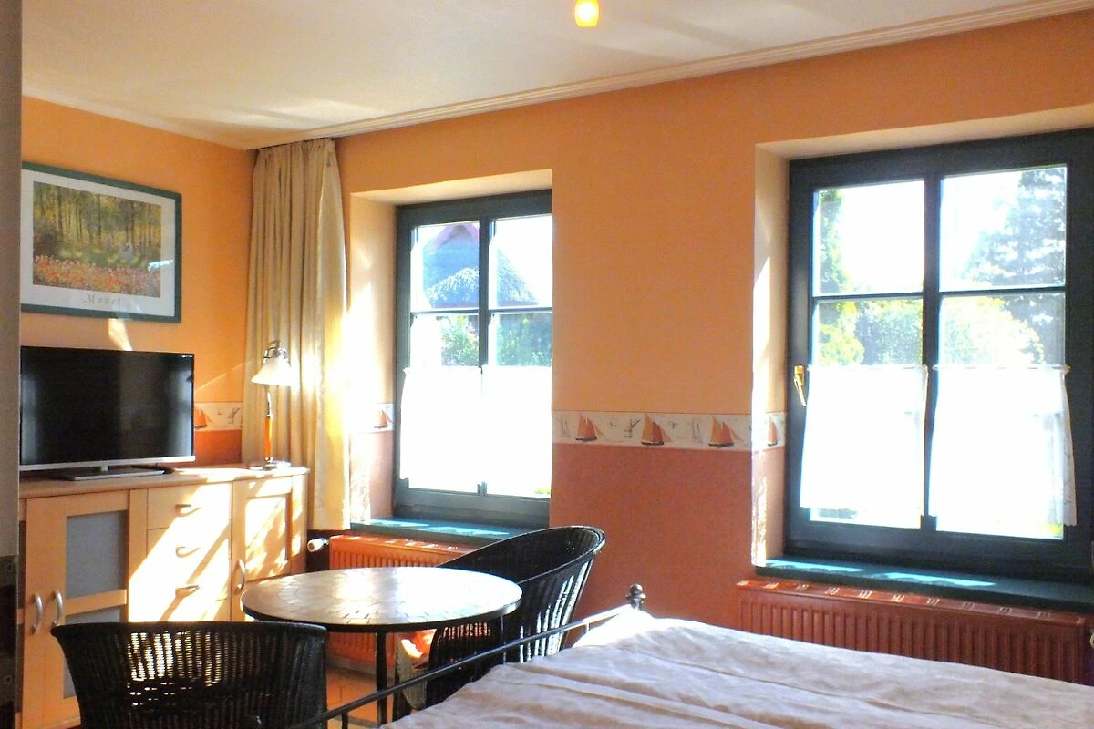 Unser Apartment, in dem Sie von der Morgensonne geweckt werden, beinhaltet alles für einen kochfreien Urlaub für ein bis zwei Gäste: ein schönes gefliestes Duschbad, WC und eine im Schrank integrierte kleine Teeküche mit Kühlschrank, Mini-Gefrierfach - Spüle - Geschirr - Kaffeemaschine Toaster Wasserkocher Spülmittel, optimal für eine Frühstückszubereitung. Desweiteren TV, Highboard, CD-Player, Bistrotisch mit Sesseln.