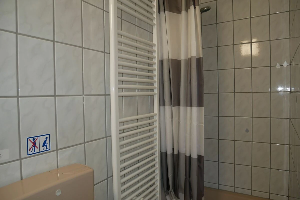 Das Badezimmer verfügt über eine Dusche mit Vorhang, Toilette, Waschbecken, Kosmetikmülleimer, Fön, Kosmetikspiegel sowie Seife und Toilettenpapier.