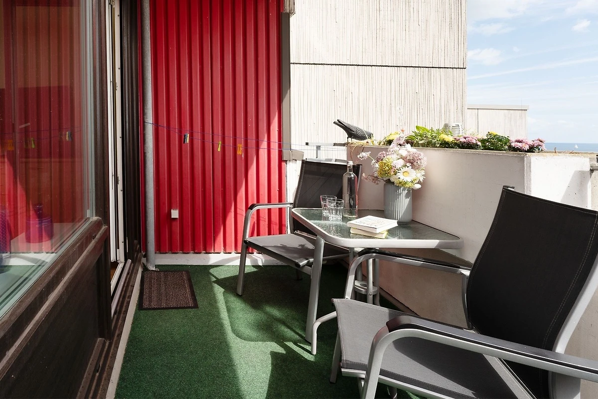 Ein PKW-Tiefgaragenstellplatz ist für Sie reserviert (max. 185 cm Durchfahrtshöhe). Die Nutzung des Hallenbades, der drei Gemeinschafts-Dachterrassen mit Meer- und Landblick sowie des Tischtennisraumes sind für Sie selbstverständlich kostenlos. Ihre mitgebrachten Fahrräder können Sie in einem der 2 Kellerräume in Haus A oder in dem Fahrradraum im Erdgeschoss zwischen Haus A und B abstellen. In Haus D befindet sich auf den Etagen 1 - 4 je ein Gemeinschaftswaschraum mit Waschmaschine und Trockner (gegen Gebühr/Münzgeräte).