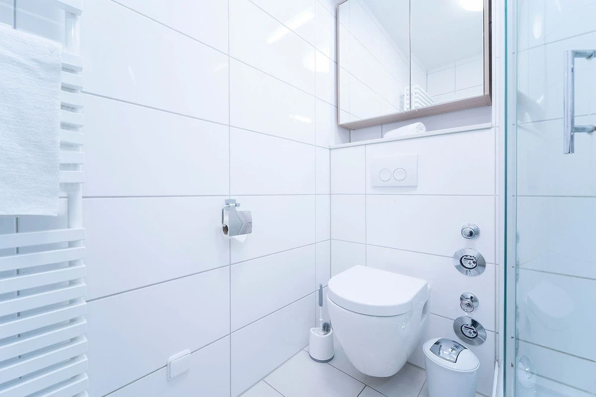 Ein PKW-Aussenstellplatz (Masse: 500x230 cm) steht Ihnen zur Verfügung. Im Keller des Hauses befindet sich eine gemeinschaftlich genutzte Waschmaschine und Trockner (Münzgeräte). Mitgebrachte Fahrräder können im Fahrradraum in der Tiefgarage oder auf dem Fahrradabstellplatz vor dem Haus abgestellt werden.