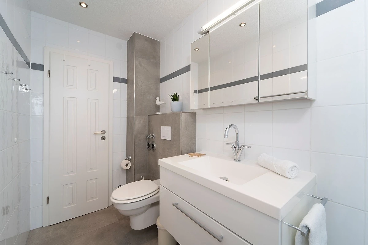 Im Keller des Hauses befindet sich eine Gemeinschafts-Waschküche mit Waschmaschine und Trockner. Diese schöne Anlage liegt direkt am Deich und verfügt ferner über einen Fahrstuhl, ein Hallenschwimmbad und eine Sauna. Der Strand und die Promenade liegen Ihnen zu Füssen. Sämtliche Einkaufsmöglichkeiten sind fussläufig erreicht.
