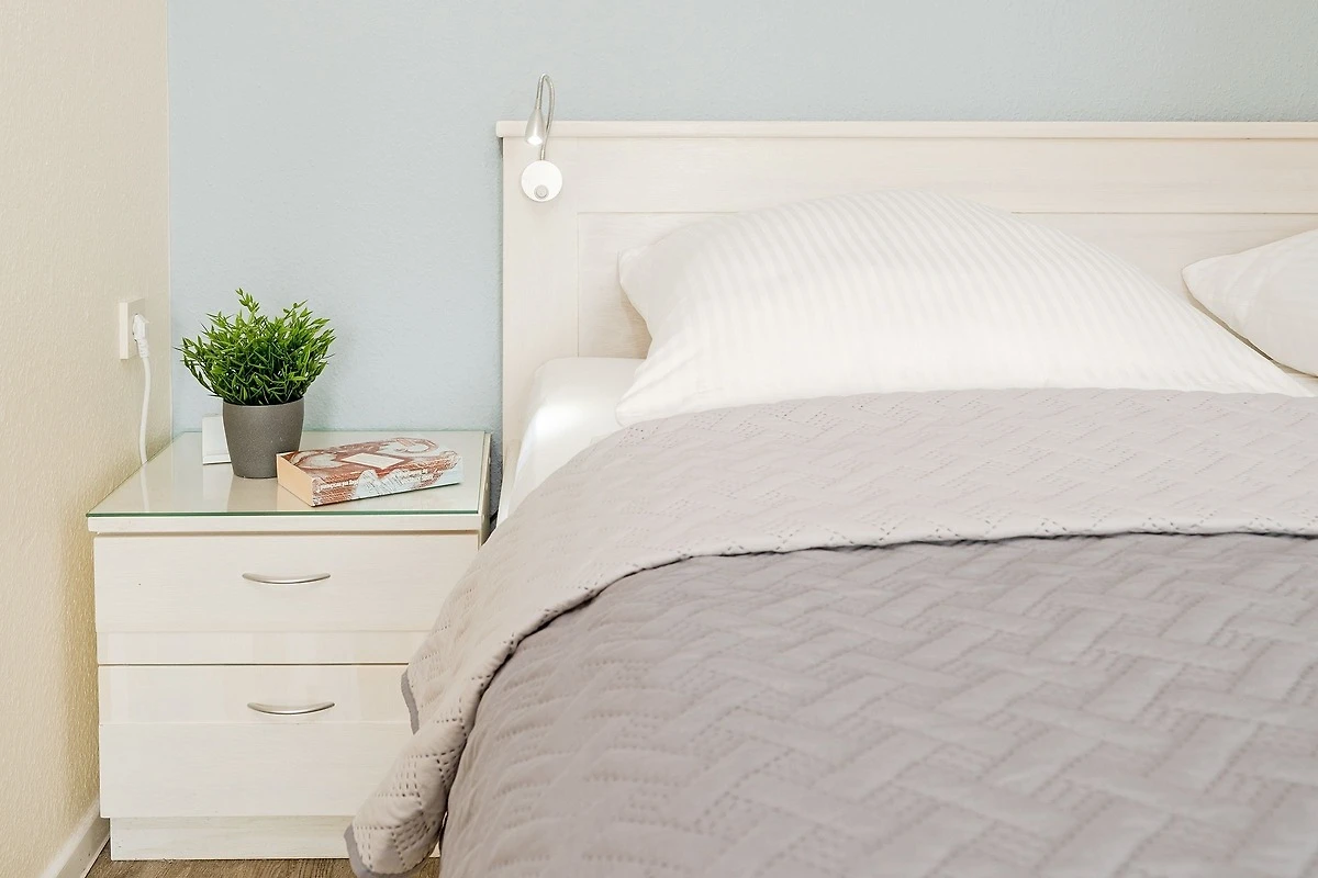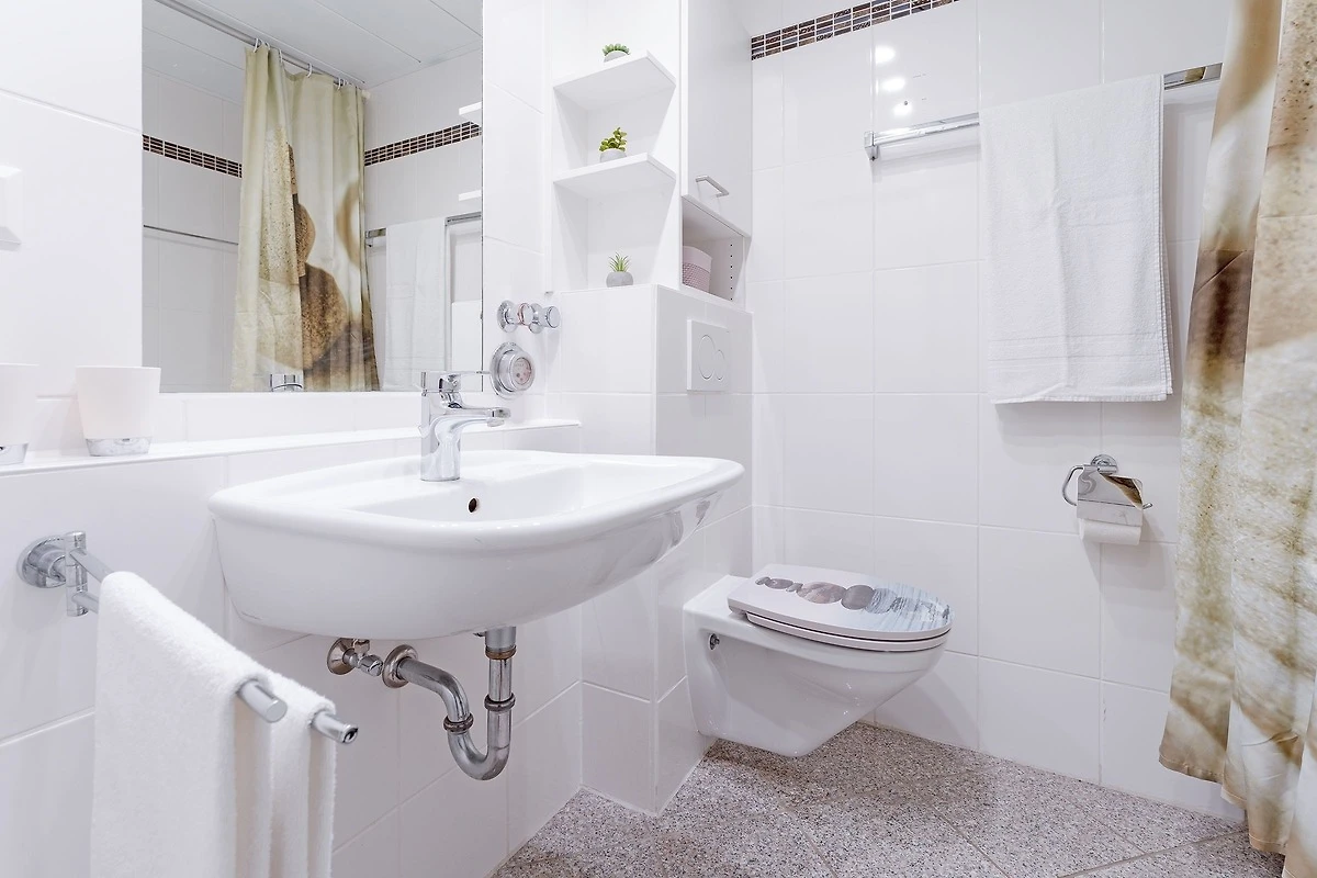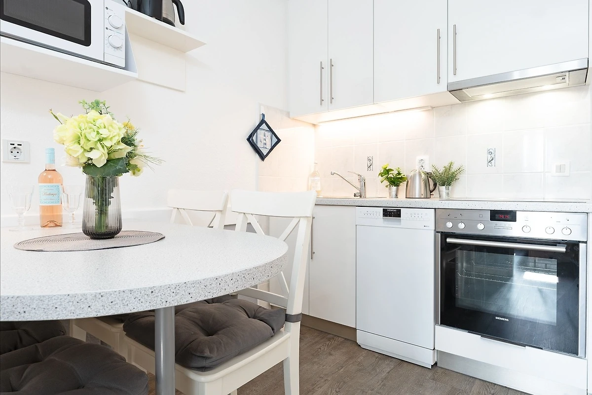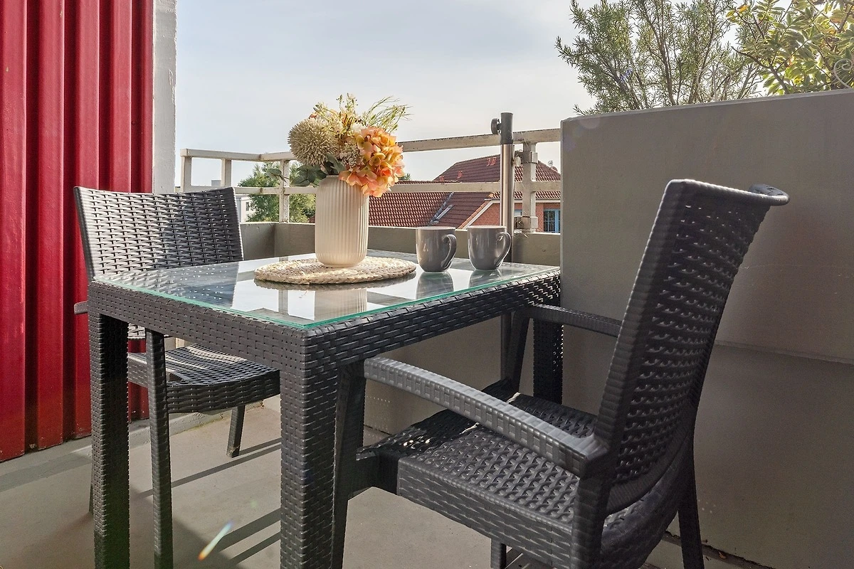 Der helle und freundliche Flur bietet Ihnen mit der Garderobe und dem Schuhschrank die Möglichkeit, Ihre Jacken und Schuhe abzulegen. Geradeaus gelangen Sie in den grossen Wohn- und Schlafbereich mit Doppelbett (2 x 90x200). Der grosse Kleiderschrank dient auch als Raumteiler zwischen dem Wohn- und Schlafbereich. Im Wohnbereich befindet sich eine gemütliche Sitzecke mit Flachbildfernseher und direktem Zugang zum möblierten Balkon. Die separate Küche mit Esstisch ist gut ausgestattet und bietet viele Extras. Das separate Schlafzimmer hält 2 Einzelbetten (je 80x200 cm), einen Kleiderschrank sowie einen weiteren Fernseher für Sie bereit. Das Badezimmer mit Badewanne rundet diese Wohnung perfekt ab. Ein absolutes Highlight sind hier die Türen mit Bullaugen. Der WLAN-Anschluss ist selbstverständlich inklusive.