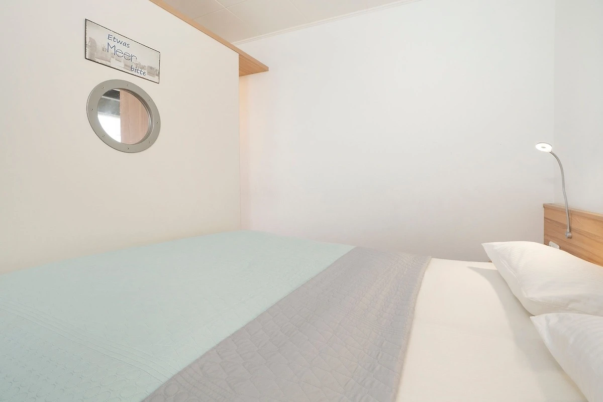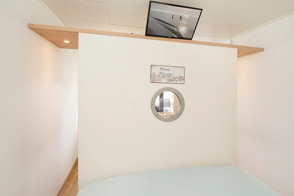 Renovierter Wohnbereich mit Essplatz für 4 Personen, im Wohnraum integrierter Schlafbereich mit hochwertigem Doppelbett (2x 90x200 cm) jeweils mit TV sowie voll ausgestatteter Einbauküche mit Kaffeevollautomat, separater Schlafraum mit 2 Einzelbetten (je 90x200 cm) und TV. Modernes Bad mit Dusche und WC.