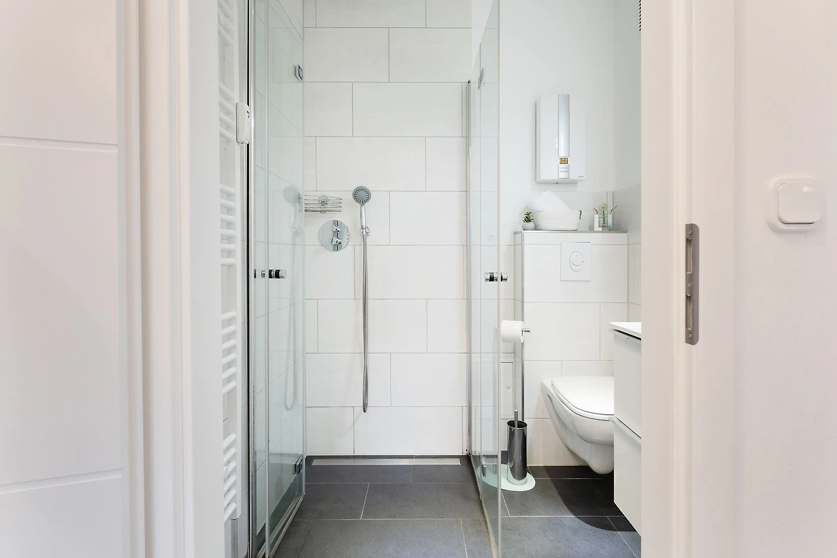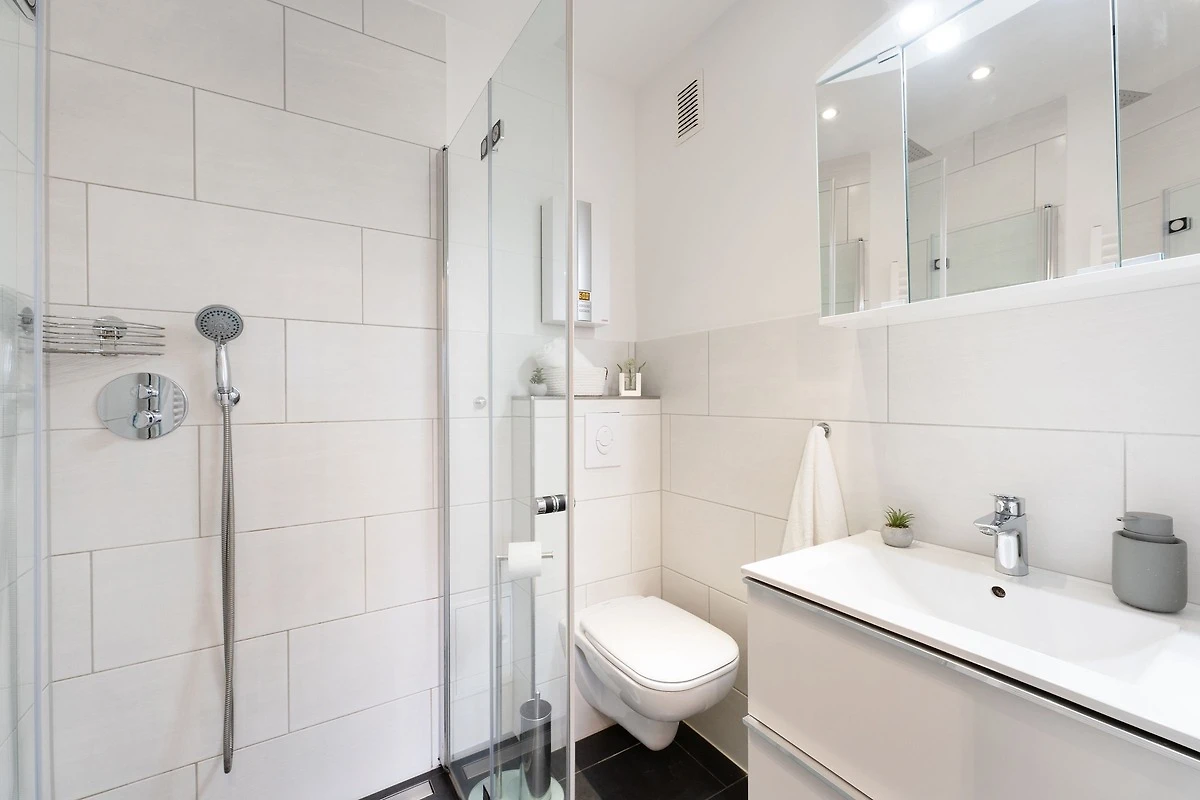 Die Wohnung ist sehr modern eingerichtet und hat alles, was benötigt wird. Wie bereits mehrfach geschrieben ist das Bad sehr klein. Auf der Toilette kann man nur schräg sitzen, für große und stämmige Personen nahezu unmöglich. Wir würden sie dennoch wieder buchen. Fahrradkeller vorhanden.