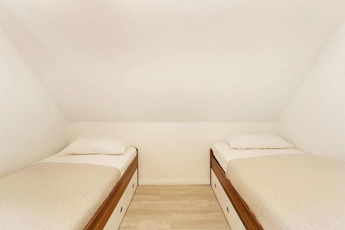 Der grosszügige Essbereich mit Panoramablick ist ideal für gesellige Frühstücksrunden oder ein heiteres Dinner mit Freunden. Möchten Sie es sich Zuhause gemütlich machen anstatt am Strand zu flanieren, dann sorgt ein grosser Flachbild-Fernseher mit 145 cm Bildschirmdiagonale im Wohnzimmer für Unterhaltung. Die separate Küche ist mit kleinen Alltagshelfern wie z. B. einem 4-Platten-Cerankochfeld, Mikrowelle und Backofen gut ausgestattet. So bereiten Sie problemlos leckere Mahlzeiten während Ihres Urlaubs zu. Zwei separate Schlafräume bieten reichlich Platz und Komfort. Eins der Schlafzimmer ist mit einem komfortablen Doppelbett mit luxuriöser Matratzenhöhe von gut 50 cm ausgestattet (Liegefläche 2x 90x200cm) - Hier werden Sie wie auf Wolken schlafen! Der grosszügige Schiebetürenschrank bietet reichlich Stauraum und nimmt problemlos Ihre Feriengarderobe auf. Das zweite Schlafzimmer mit 2 Einzelbetten (je 90x200cm), die lauschig unter der Dachschräge platziert sind, garantiert ebenso erholsame Stunden. Modern und stilsicher schliesst sich das stilvolle Designbad mit Annehmlichkeiten wie bodentiefer Wellnessdusche (90x90 cm mit Regenfunktion), beheizbarem Handtuchhalter, WC und Waschtisch dem überzeugenden Ambiente der Wohnung an.