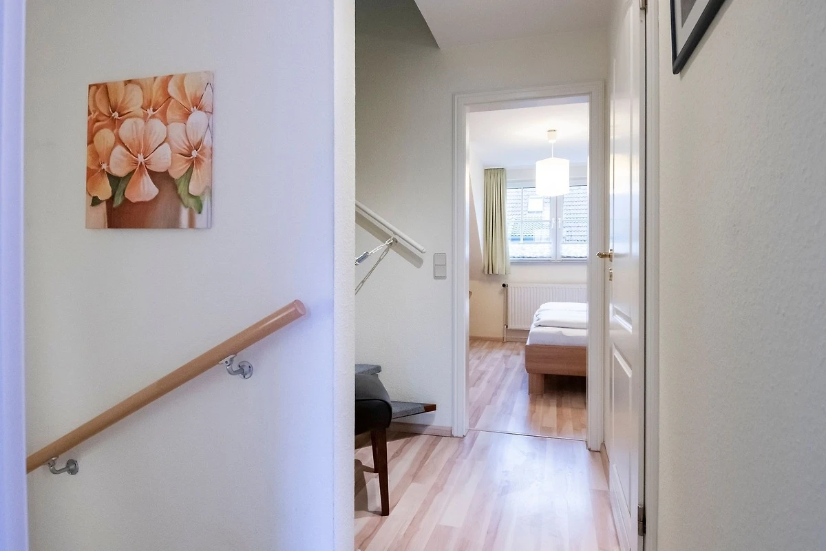 In der 1.Etage erwarten Sie Ihre Schlafräume mit jeweils einem Doppelbett (2 Matratzen, 90 x 200 cm) und das Vollbad mit WC.