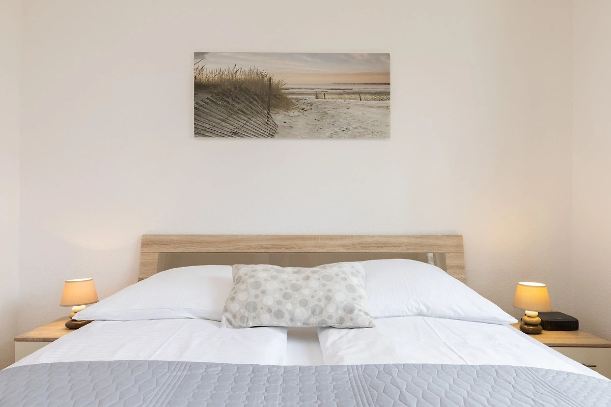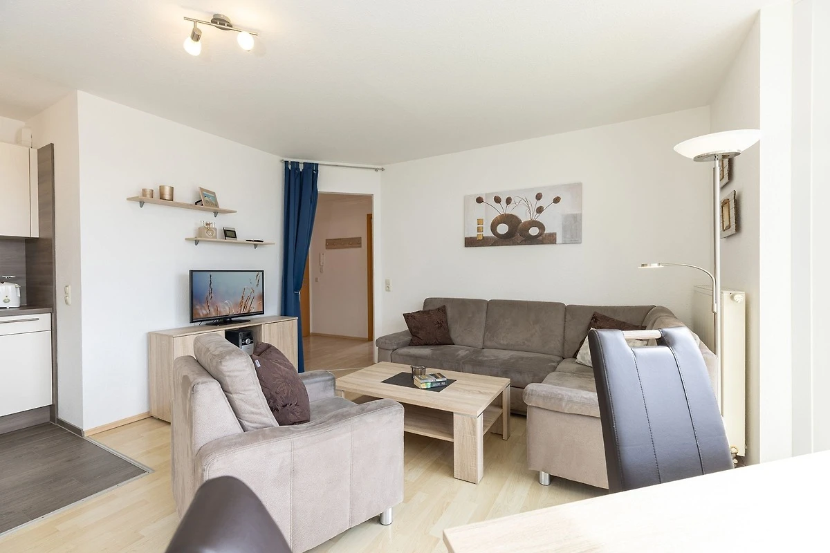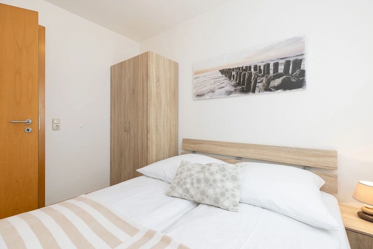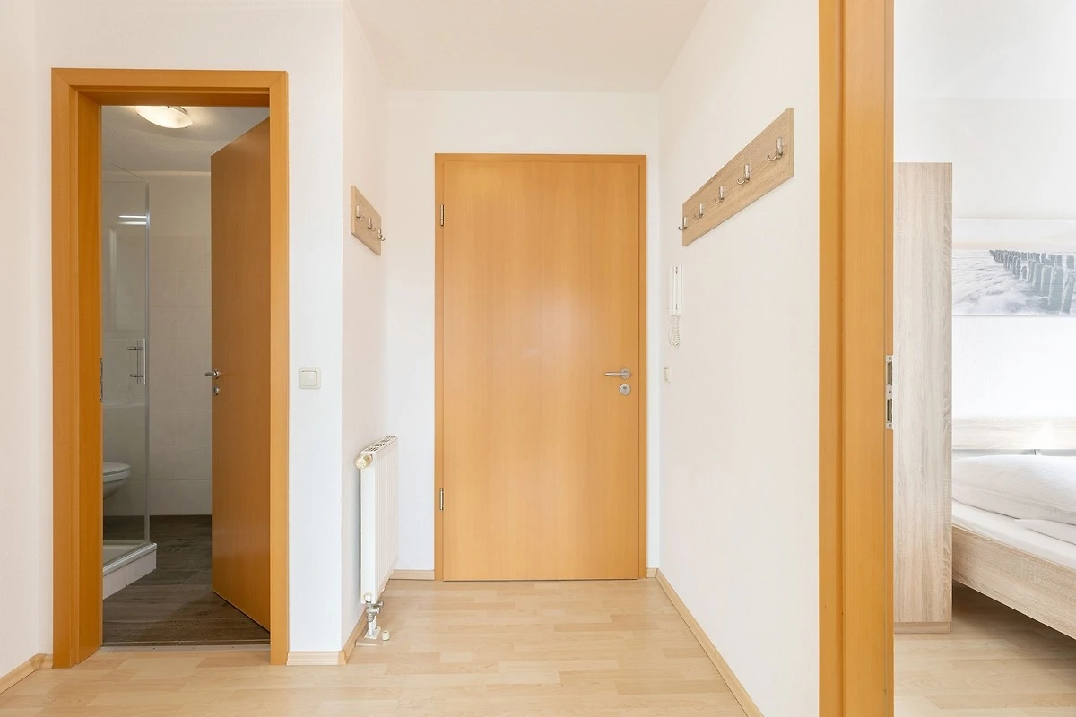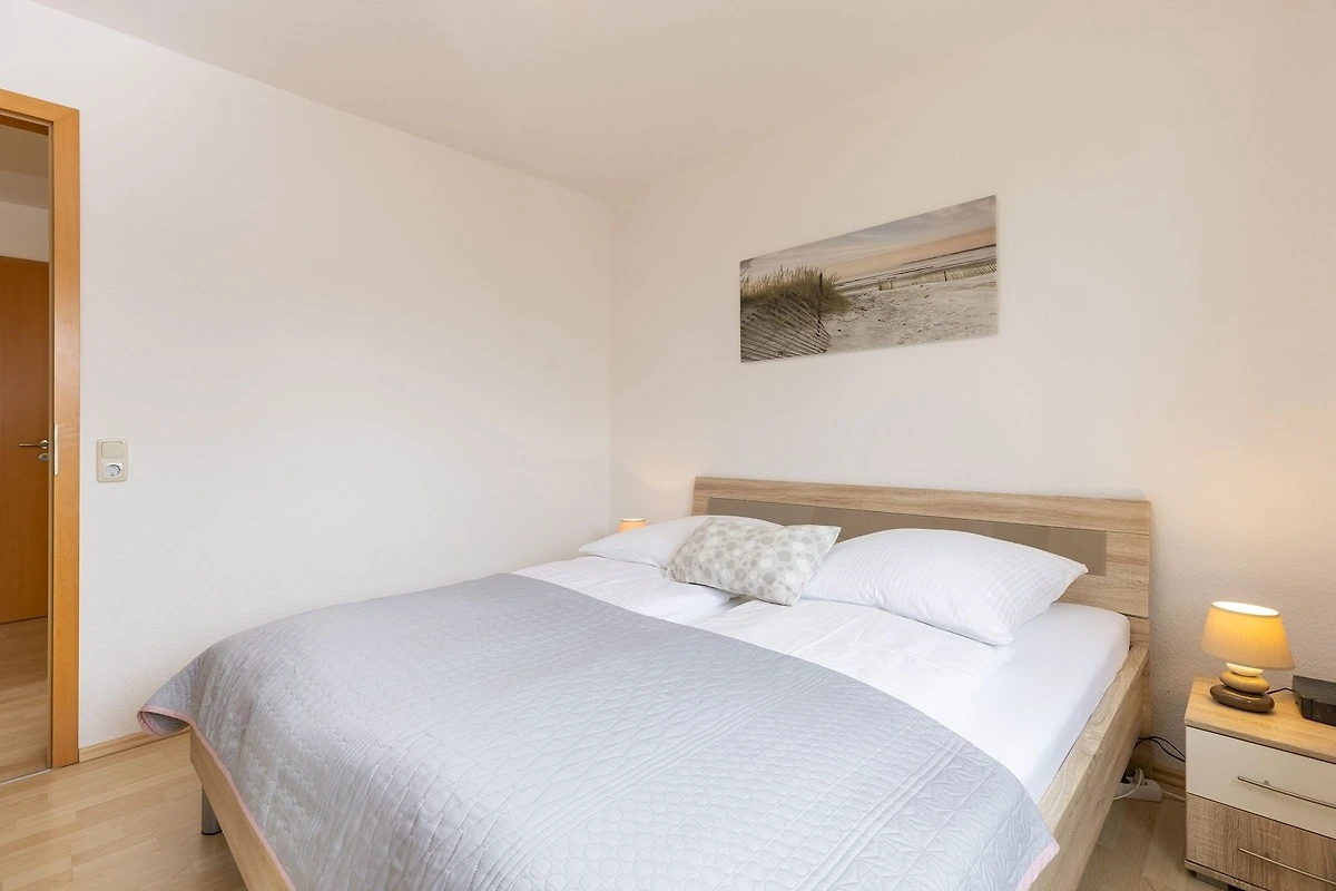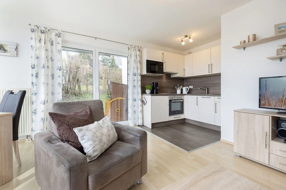 Vom kombinierten Wohn- und Essraum mit Erker und L-förmiger Küchenzeile gelangen Sie direkt auf die möblierte Terrasse mit eigenem Strandkorb. Die Ferienwohnung bietet ein Wohnzimmer, zwei Schlafzimmer (mit je einem Doppelbett á 2x 80x200cm), ein Badezimmer mit Dusche und WC sowie einen Abstellraum. Ein zweiter Fernseher steht Ihnen in einem der Schlafzimmer zur Verfügung. Für einen entspannten Schlaf sind die Schlafzimmer mit Fliegengittern ausgestattet.