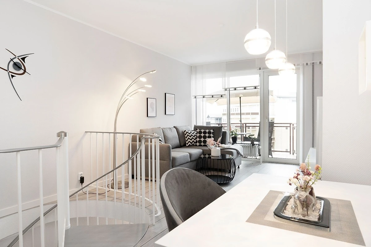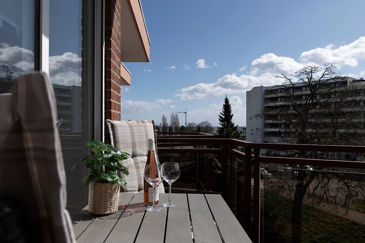 Von einem kleinen Flur gelangen Sie in das Schlafzimmer, in dem ein komfortables Doppelbett (2x 90x200 cm) darauf wartet, Ihnen traumhafte Nächte zu bescheren. Auf dem eigenen Balkon können Sie den Tag direkt nach dem Aufstehen mit gesunder Ostseeluft begrüssen. Ihre Urlaubsgarderobe verstauen Sie bequem im grossen Kleiderschrank. Auf dieser Ebene befindet sich ausserdem das moderne Duschbad. Über eine Wendeltreppe erreichen Sie den individuell gestalteten Wohnbereich, der viel Raum für eine erholsame Auszeit bietet. Auf dem gemütlichen Sofa können Sie die Seele baumeln lassen. Ein TV-Gerät, eine Hifi-Anlage und ein kostenloser WLAN-Anschluss sorgen für Unterhaltung. Ausserdem erwartet Sie eine offene Küche mit separatem Essplatz. Der Ceranherd mit Backofen, Kühlschrank inkl. Gefrierfach, Spülmaschine und weitere Annehmlichkeiten werden Sie begeistern. Bereiten Sie sich doch einen fangfrischen Ostseefisch in Ihrer Unterkunft zu. Diesen können Sie dann auf dem möblierten Balkon mit seitlichem, saisonalen Blick auf die Ostsee und einem Glas Wein geniessen. Die gesamte Wohnung ist durch Aussenjalousien verdunkelbar.