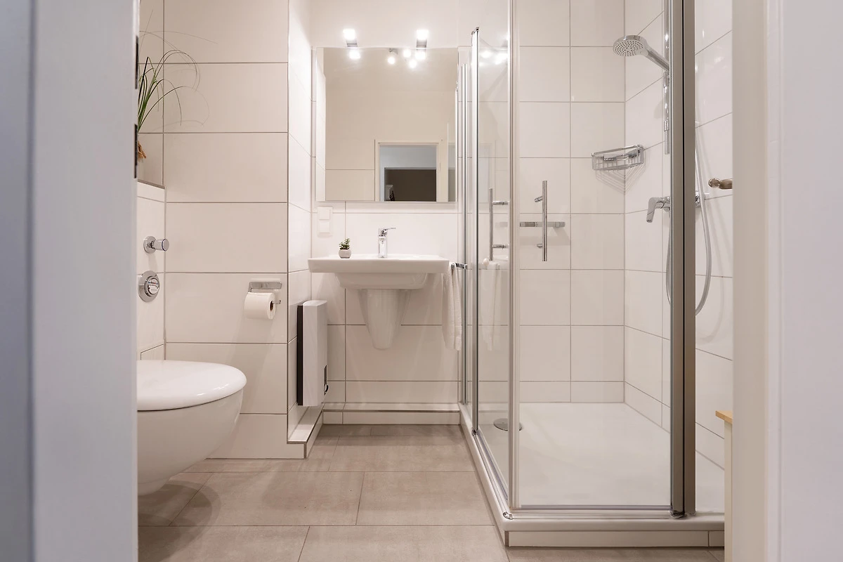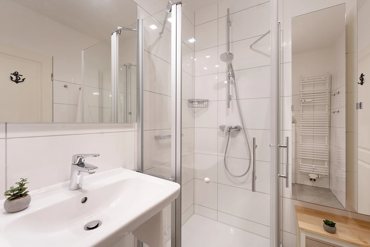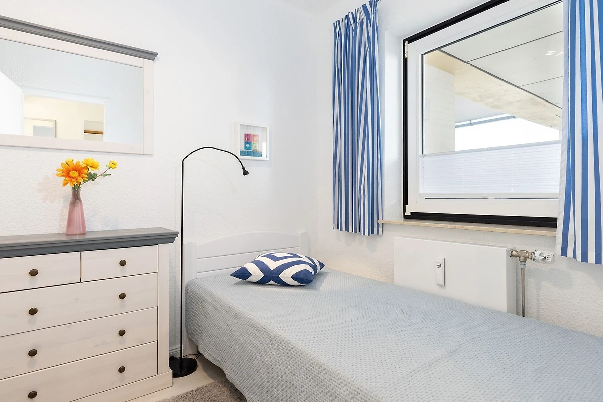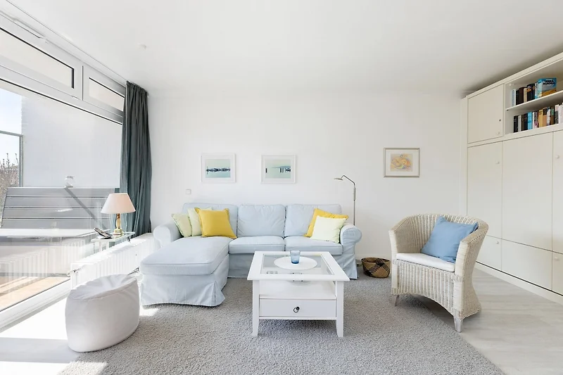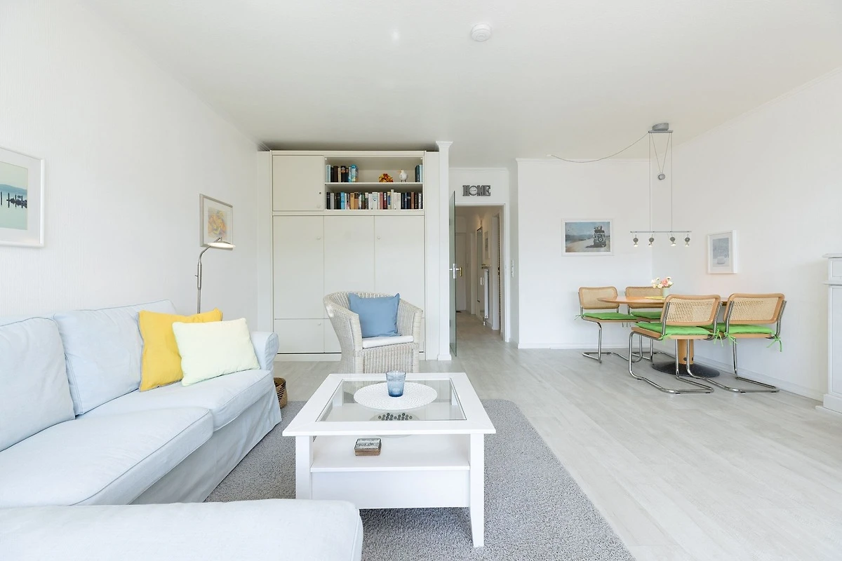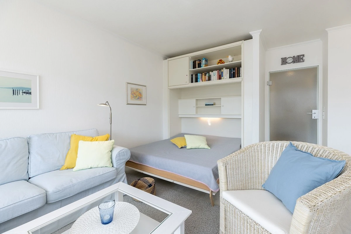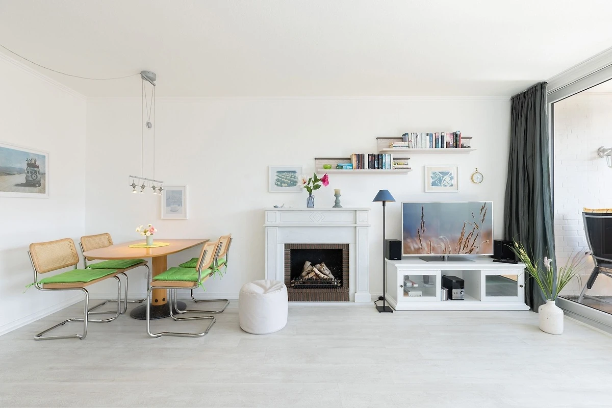 Der offene Wohn-/Schlafbereich empfängt Sie lichtdurchflutet und mit harmonischem Interieur im maritimen Landhausstil. Ein hochwertiges Schrankbett bietet hier eine bequeme Schlafmöglichkeit für bis zu 2 Personen (2x 80x200 cm). Eine gemütliche Fernseh-Ecke mit komfortablem Ecksofa , Sessel, Flachbild-TV und einem heimeligen Dekokamin sorgen nach langen Strandtagen für geruhsame Stunden. Der angrenzende Essbereich ist für bis zu 4 Personen ausgerichtet und bietet Platz für gesellige Mahlzeiten. Ein direkter Zugang führt vom Wohnzimmer auf den möblierten Balkon mit West-Ausrichtung und seitlichem, saisonalen Meerblick. Von der charmanten Eckbank schauen Sie durch Baumwipfel auf die funkelnde Ostsee. Im Aussenbereich dient eine Markise als Schutz vor zu starker Sonneneinstrahlung. Im Eingangsbereich der Wohnung gibt es einen geräumigen Kleiderschrank mit reichlich Stauraum für Ihre Urlaubsgarderobe. Vom Flur aus erreichen Sie alle weiteren Räume. Das helle Bad ist mit Dusche, WC, Waschtisch und beleuchtetem Spiegel, sowie einem beheizbaren Handtuchhalter ausgestattet. Ein separates Schlafzimmer mit 2 Einzelbetten (je 90x200 cm) und einer Kommode ist ebenfalls hell und nordisch-modern eingerichtet und bietet einen lauschigen Rückzugsort für bis zu 2 Personen. In der separaten Küche erleichtern kleine Alltagshelfer wie z.B. ein 4-Platten Ceranherd, ein kombinierter Backofen mit Mikrowelle, sowie eine Spülmaschine die Küchenarbeit während des Urlaubs.