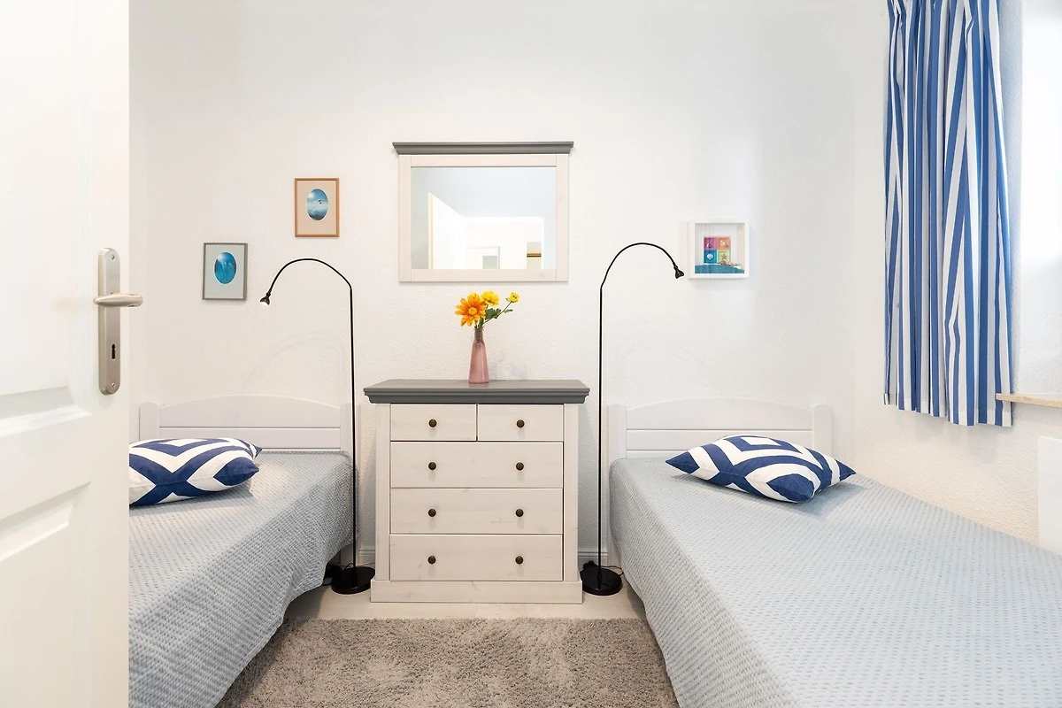 Schlafzimmer: 2 Einzelbetten (je 90x200 cm), kein Platz für Kinderreisebett vorhanden