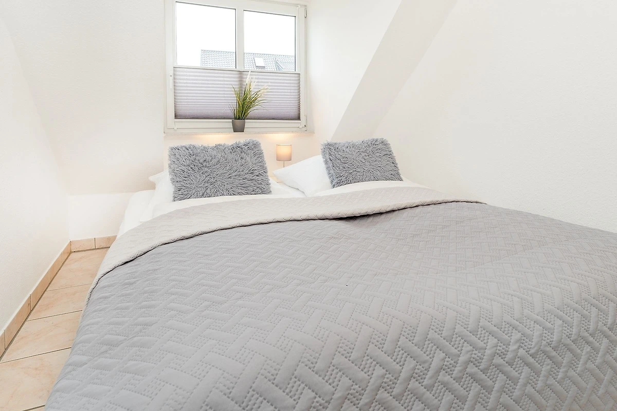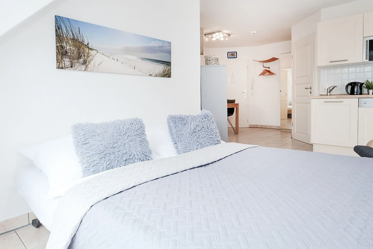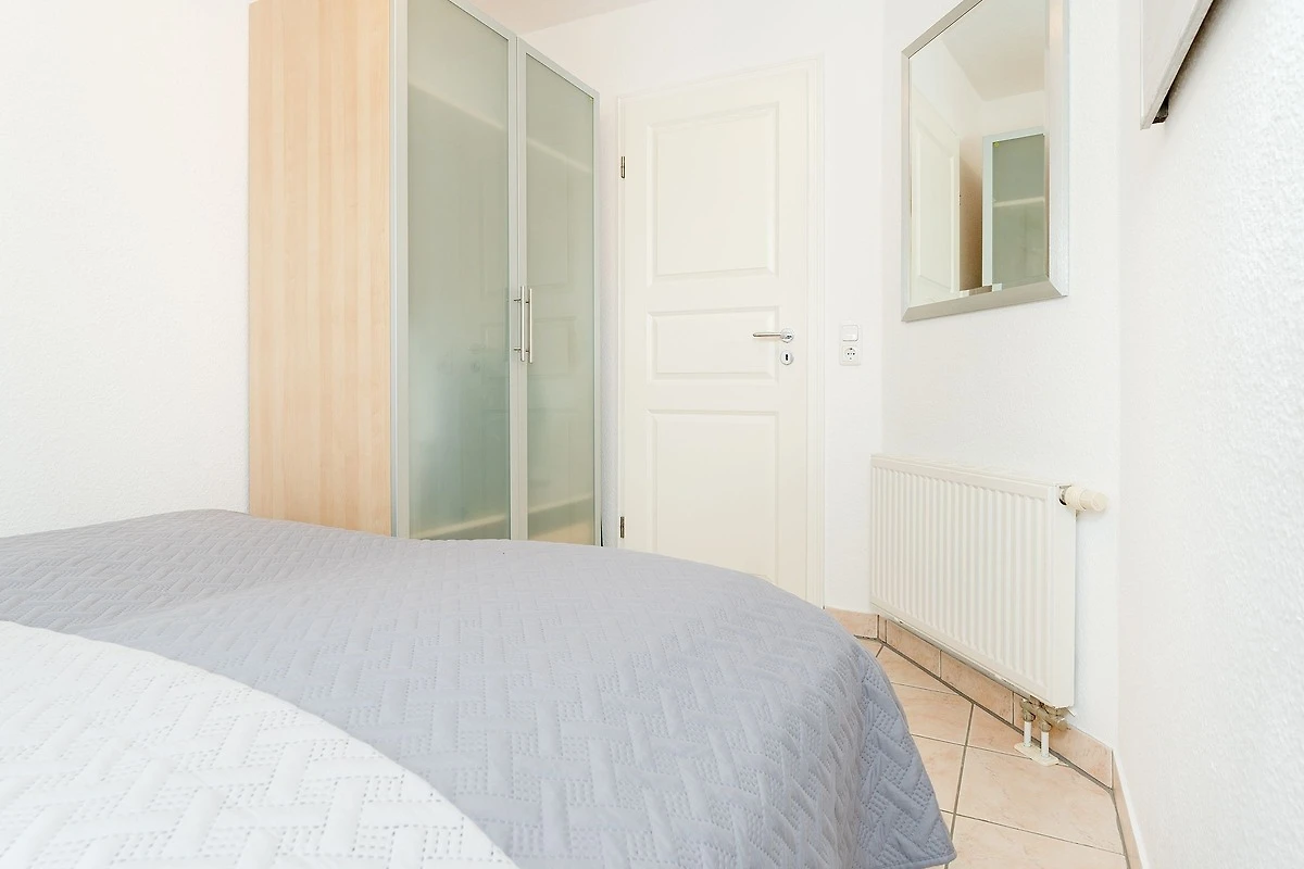 Die Wohnung befindet sich in einer Seitenstraße, ruhige Lage.Das Haus hat einen Aufzug. Zum Bäcker und Strand mit eigenem Strandkorb 2-3 Gehminuten. Das Schlafzimmer ist sehr klein und eher für schlanke Leute geeignet. Ansonsten ist die Wohnung für zwei Personen perfekt.