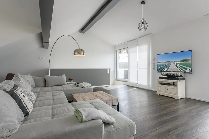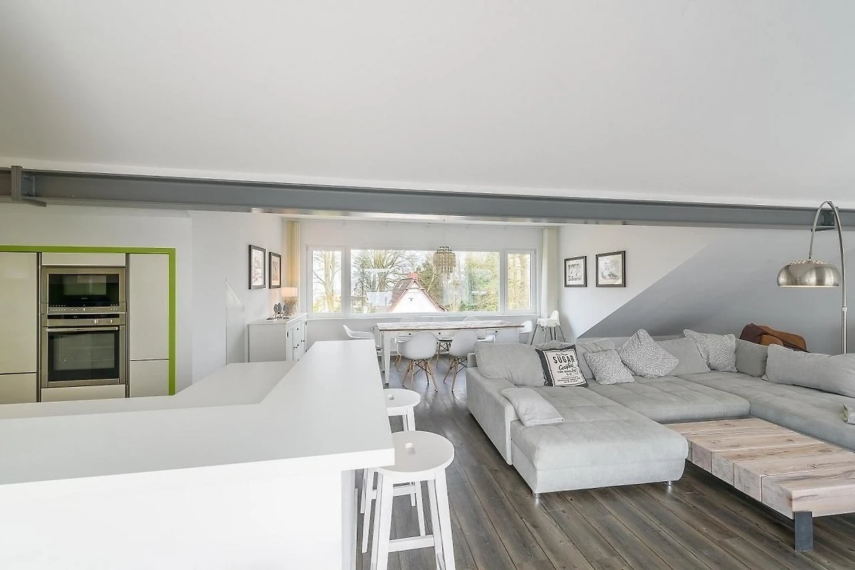 Eine Treppe mit Designbodenbelag führt Sie in den oberen Bereich. Wow... werden Ihre ersten Worte sein! Auf der gesamten Ebene ist der offene Wohn- Essbereich mit einer 42qm grossen Dachterrasse. Charmante Dachschrägen mit freiliegenden Stahlträgern, lichtdurchflutetet durch die breite bodentiefe Fensterfront besticht dieser Raum. Eine grosse Sofalandschaft ausgerichtet zum Balkon lädt zum Entspannen nach einem erlebnisreichen Urlaubstag ein. Gegenüber, die moderne vollausgestattete Küche, die keine Wünsche offen lassen dürfte. Am Tresen können Sie einen kleinen Aperitif geniessen. "Tafeln Sie auf" .... ein grosser Esstisch lädt dazu ein.