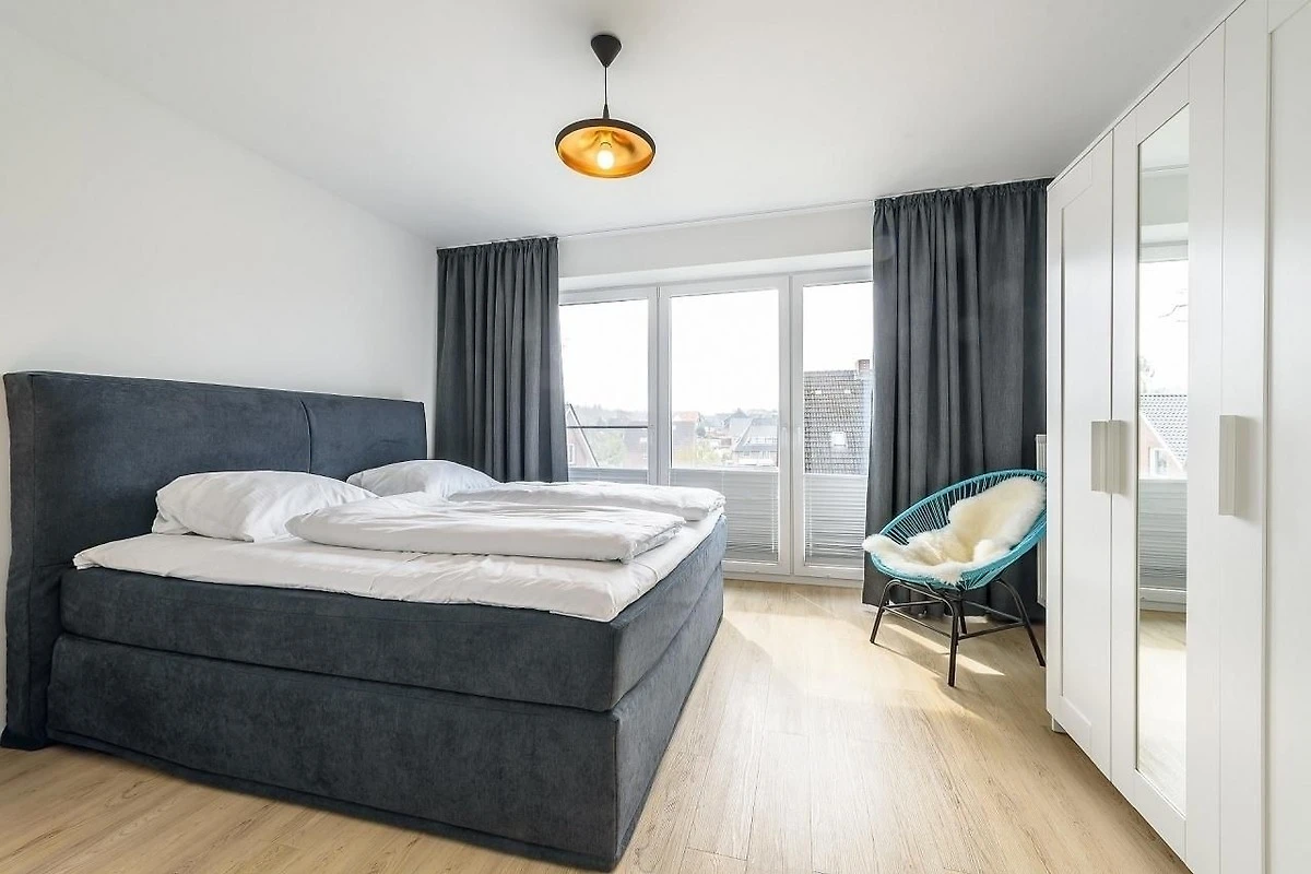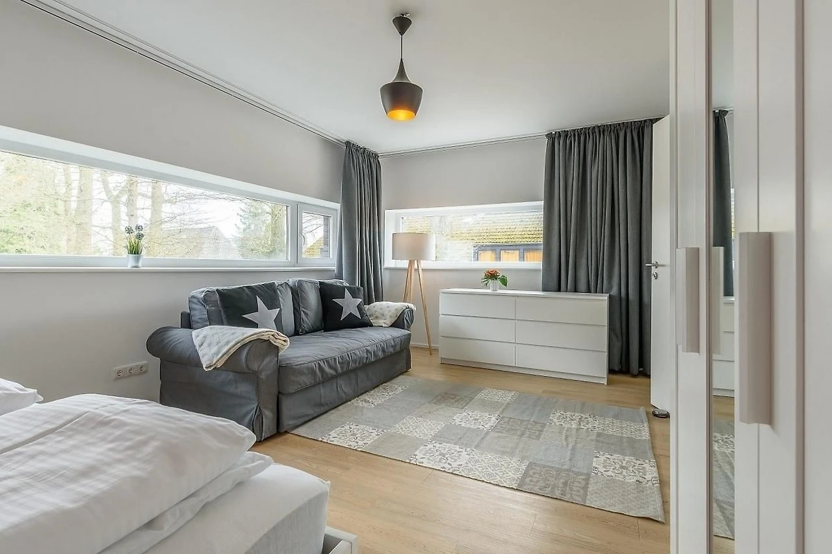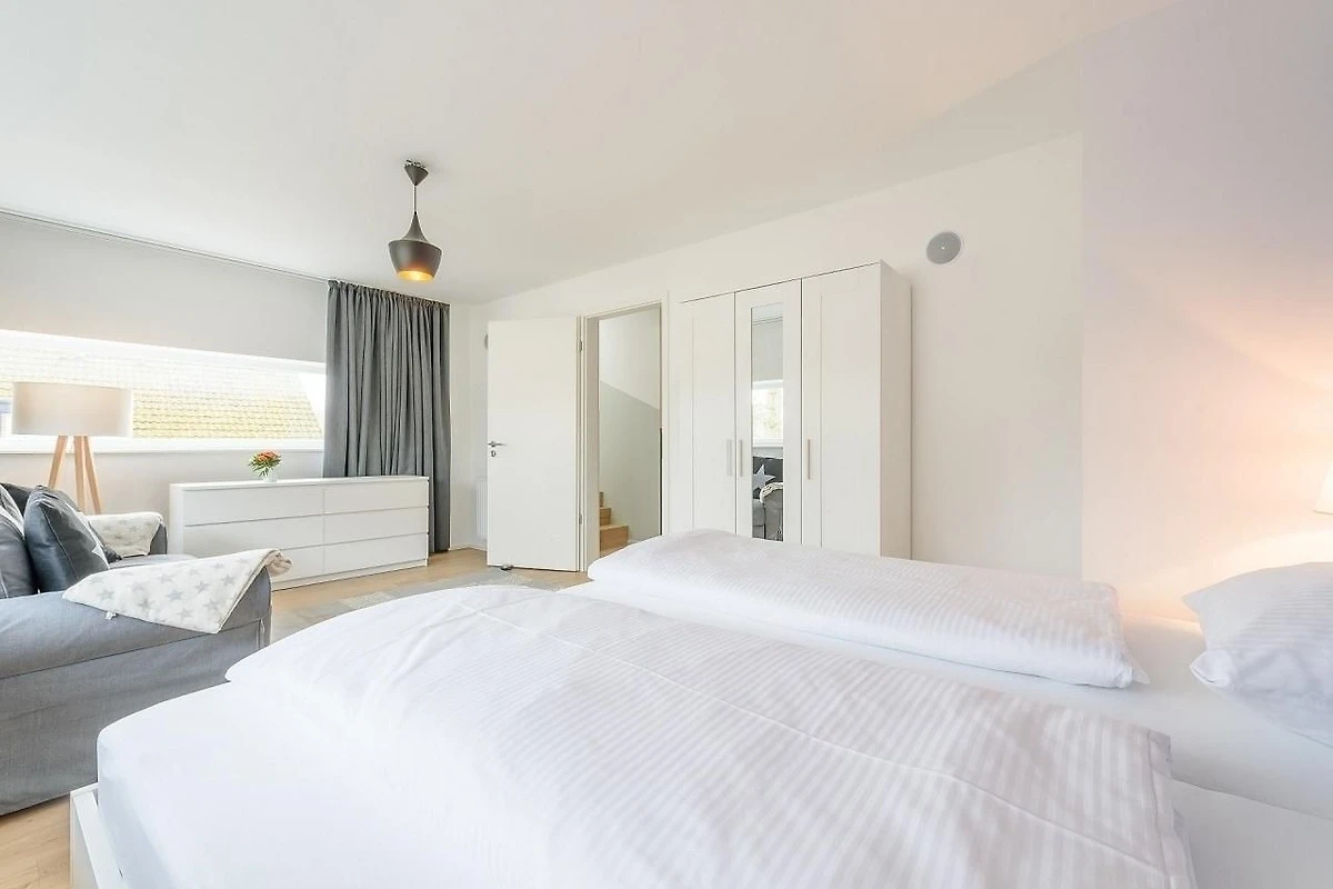 Verbunden durch breite Flure sind auf dieser Ebene insgesamt 3 separate Schlafzimmer, 2 Bäder und ein Ankleidezimmer. Am Ende des Flures auf der rechten Seite befindet sich ein Schlafzimmer mit Boxspringbett (180x200 cm), Kommode und Flatscreen TV. Daneben ein modernes Vollbad mit Badewanne und Dusche. Ein Ankleidezimmer mit zwei durchgängig offenen Schränken trennt die beiden "Elternschlafzimmer" auf dieser Seite. Im 2. Schlafzimmer sind ebenfalls ein Boxspringbett (180x200cm) und ein zusätzlicher Kleiderschrank. Diese beiden Schlafzimmer haben bodentiefe Fenster mit Plissees und Verdunkelungsgardinen. Ein Tageslicht helles Duschbad mit Rainshower-Dusche ist gleich daneben. Links von der Eingangstür ist das 3. grosszügige Schlafzimmer mit Doppelbett (2x 90x200 cm), Schlafsofa (160x200 cm), Kleiderschrank und Kommode. Ausreichend Platz für die "Kleinen" zum Spielen ist hier vorhanden.