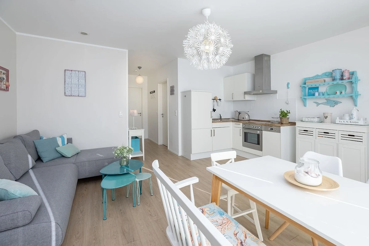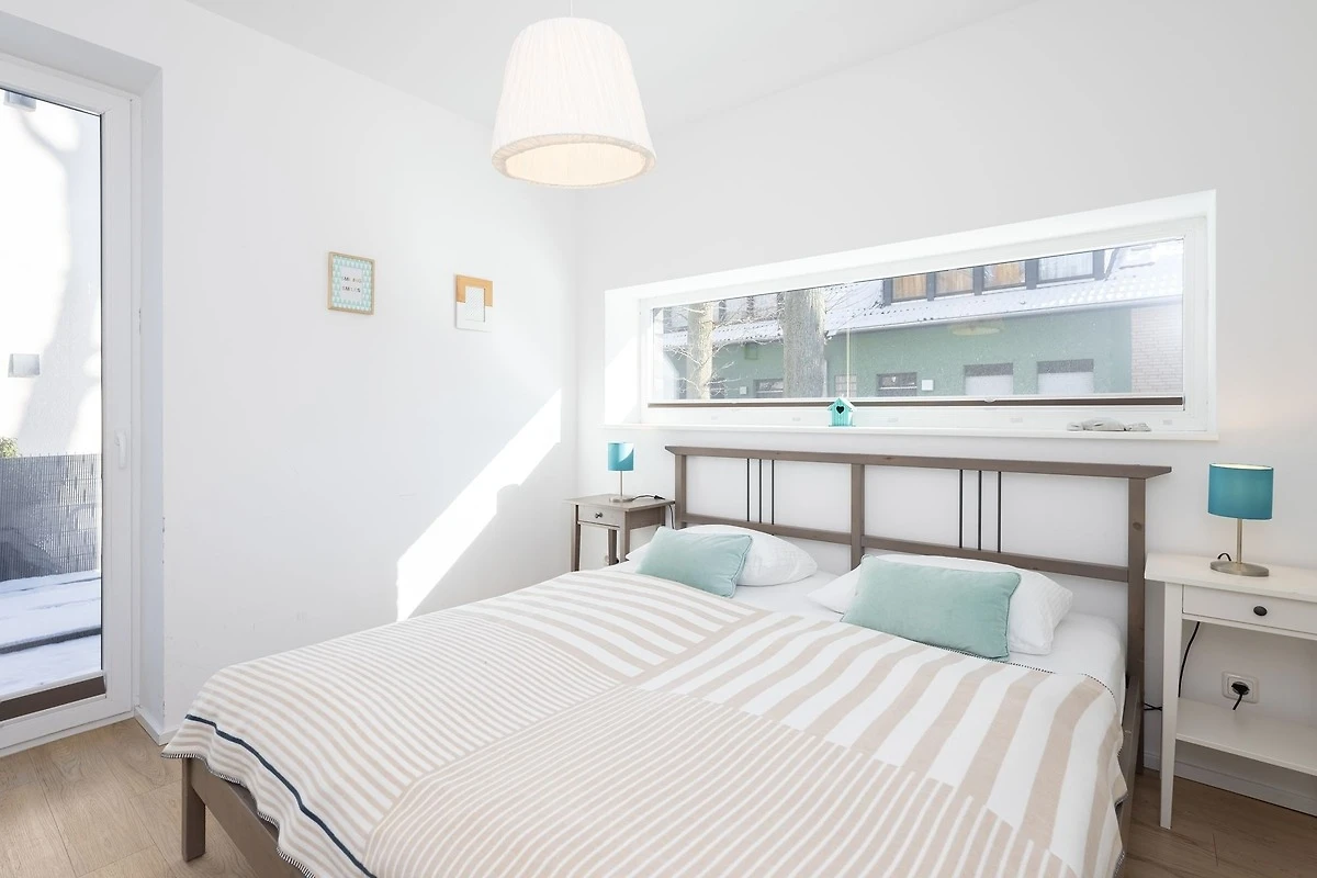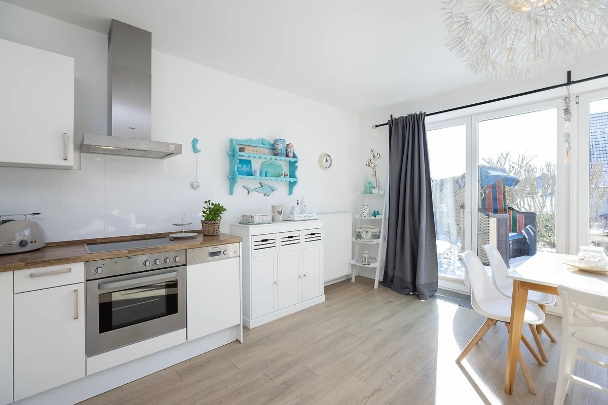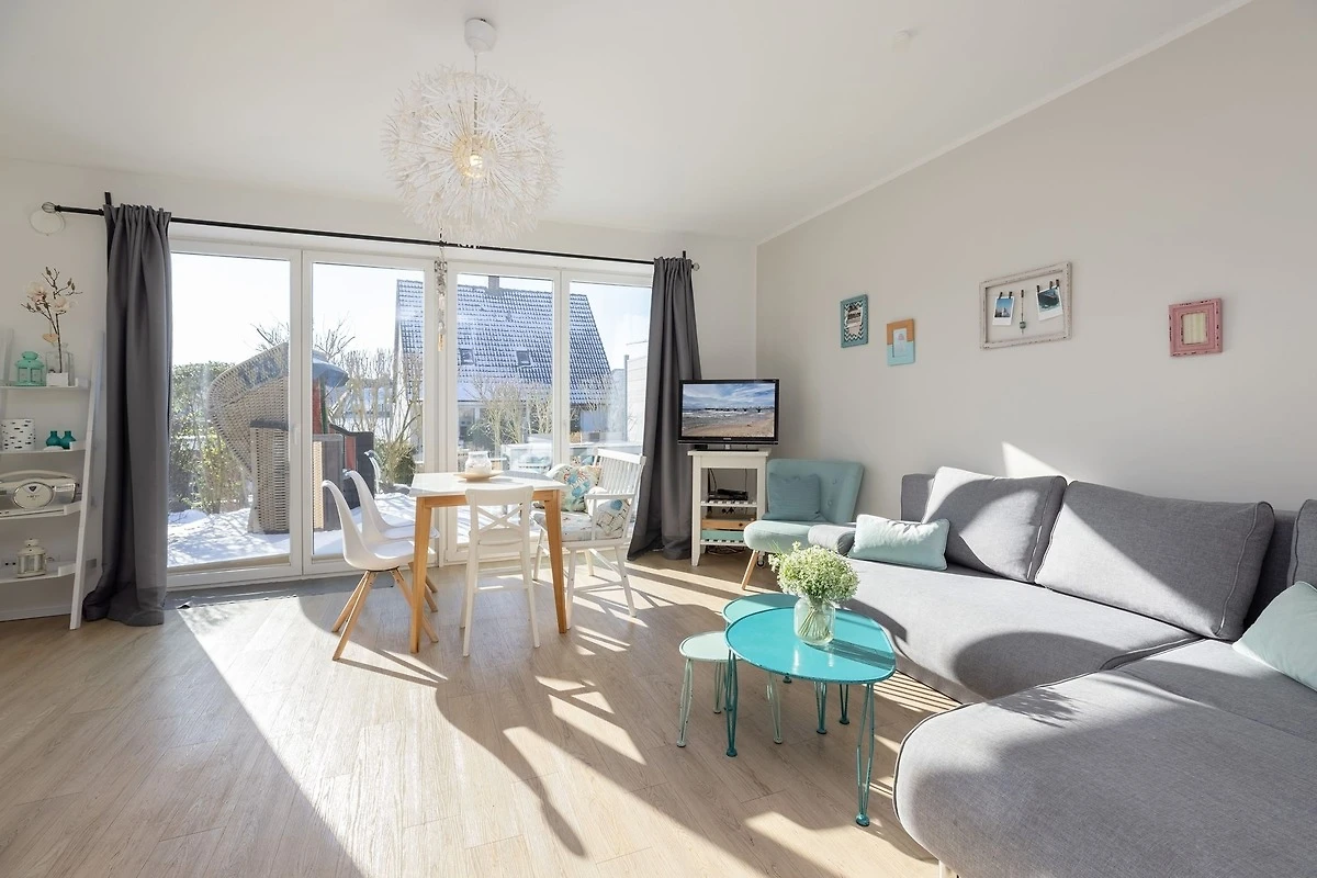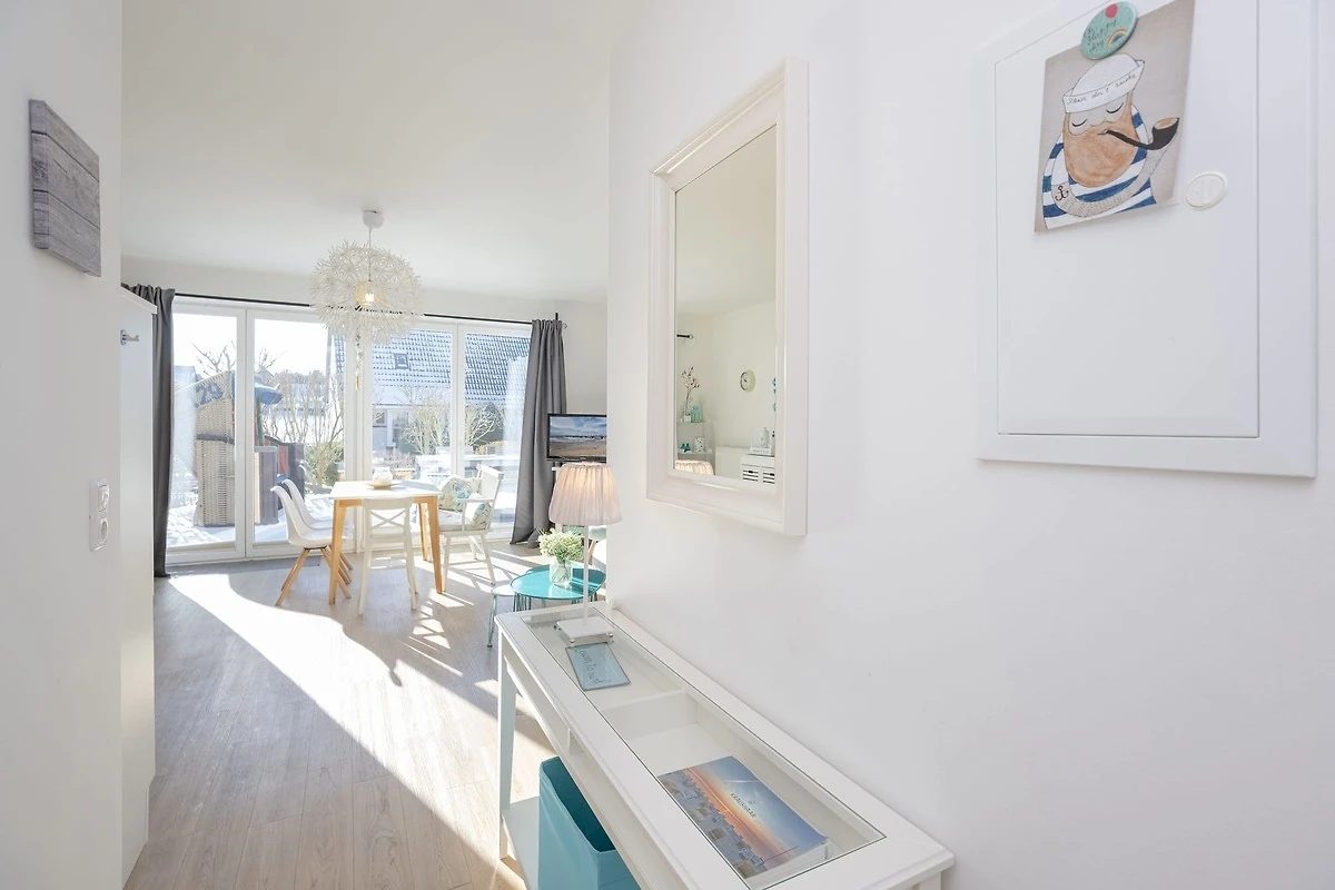 Schliessen Sie auf und treten Sie ein! Ein heller Flur mit Garderobe empfängt Sie. Gleich geradezu das Wohnzimmer mit Essplatz und offener bestens ausgestatteter Küchenzeile strahlt mit seinen nordischen Farbtönen und geschmackvollen Details. Öffnen Sie die Terrassentür und denken Sie schon mal an das Frühstück, das Sie draussen in aller Ruhe geniessen können oder zwischendurch ein Buch im Strandkorb lesen. Herrlich entspannen können Sie auf der gemütlichen Sofaecke und dabei einen guten Film ansehen oder Ihren Freunden zu Hause ein paar Urlaubsbilder senden. Im Handumdrehen können Sie das Sofa zu einem Schlafplatz herrichten, Verdunkelungsgardinen an den bodentiefen Fenstern sorgen für eine angenehme Nachtruhe. Am anderen Flurende ist das Schlafzimmer mit Doppelbett (2x 80x200 cm) und einem Kleiderschrank. Verdunkelungsplissees sind hier am Fenster angebracht. Daneben ist das tageslichthelle Duschbad mit ebenerdiger Dusche, Handtuchwärmer und Föhn.