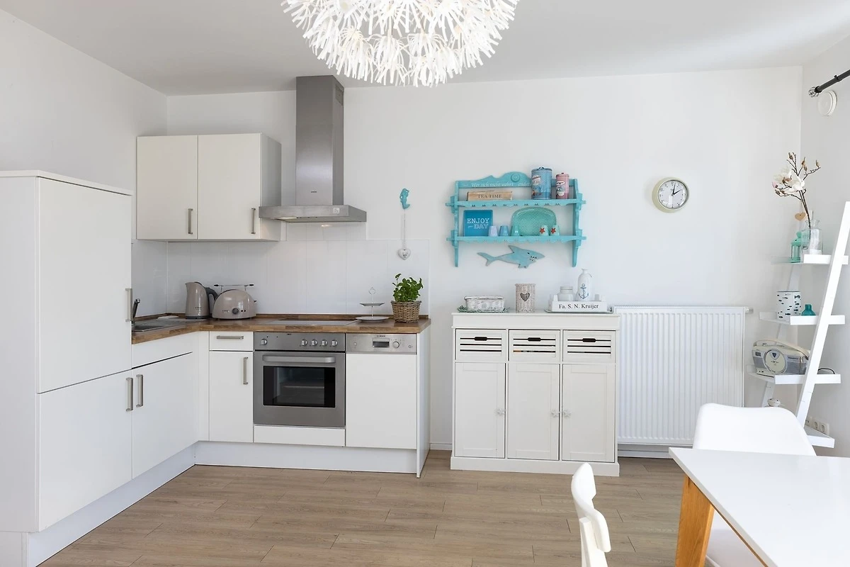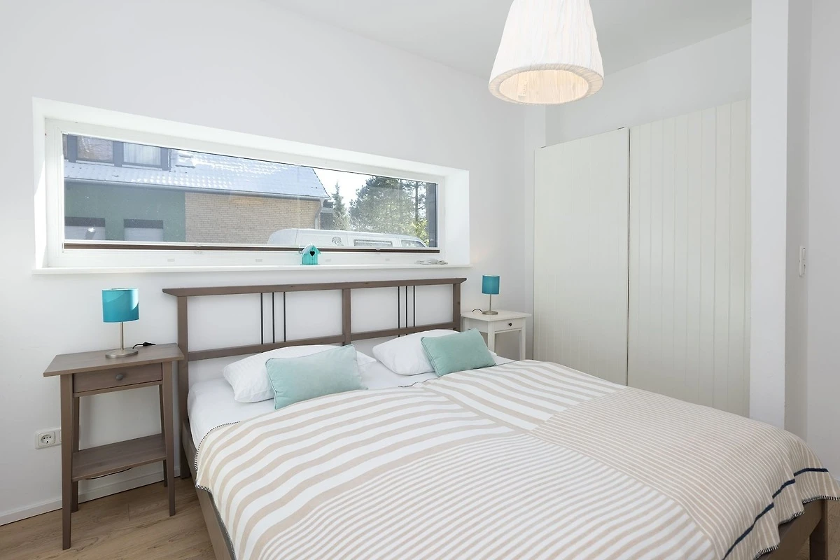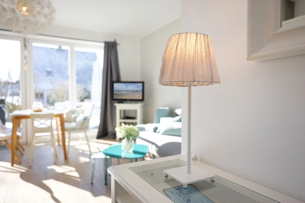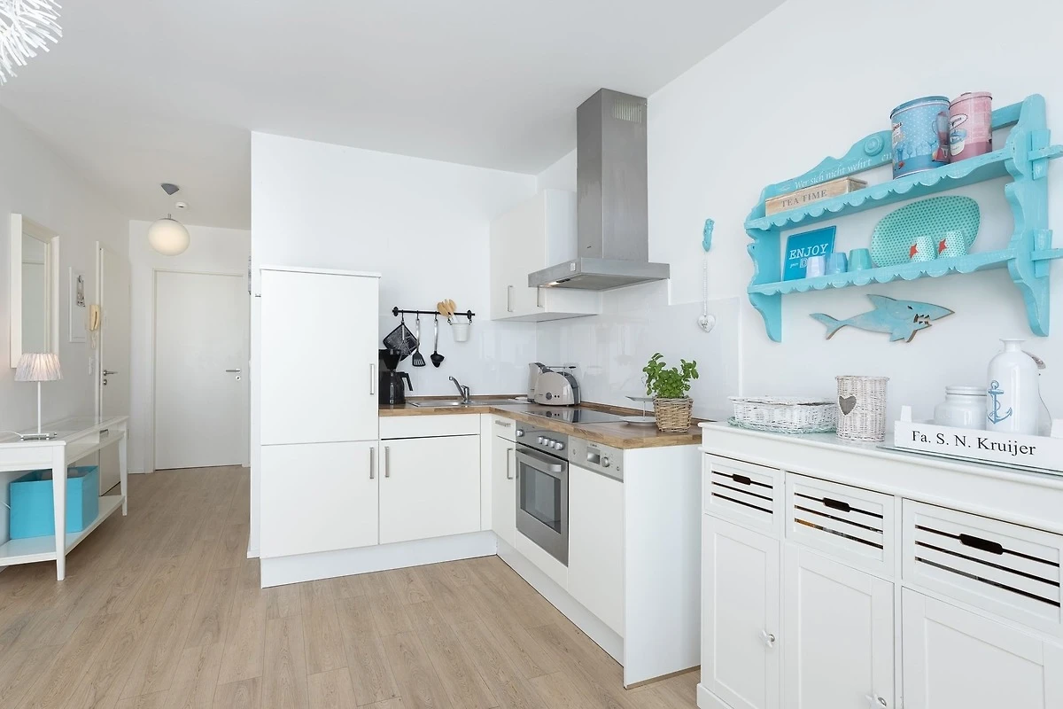 Schliessen Sie auf und treten Sie ein! Ein heller Flur mit Garderobe empfängt Sie. Gleich geradezu das Wohnzimmer mit Essplatz und offener bestens ausgestatteter Küchenzeile strahlt mit seinen nordischen Farbtönen und geschmackvollen Details. Öffnen Sie die Terrassentür und denken Sie schon mal an das Frühstück, das Sie draussen in aller Ruhe geniessen können oder zwischendurch ein Buch im Strandkorb lesen. Herrlich entspannen können Sie auf der gemütlichen Sofaecke und dabei einen guten Film ansehen oder Ihren Freunden zu Hause ein paar Urlaubsbilder senden. Im Handumdrehen können Sie das Sofa zu einem Schlafplatz herrichten, Verdunkelungsgardinen an den bodentiefen Fenstern sorgen für eine angenehme Nachtruhe. Am anderen Flurende ist das Schlafzimmer mit Doppelbett (2x 80x200 cm) und einem Kleiderschrank. Verdunkelungsplissees sind hier am Fenster angebracht. Daneben ist das tageslichthelle Duschbad mit ebenerdiger Dusche, Handtuchwärmer und Föhn.