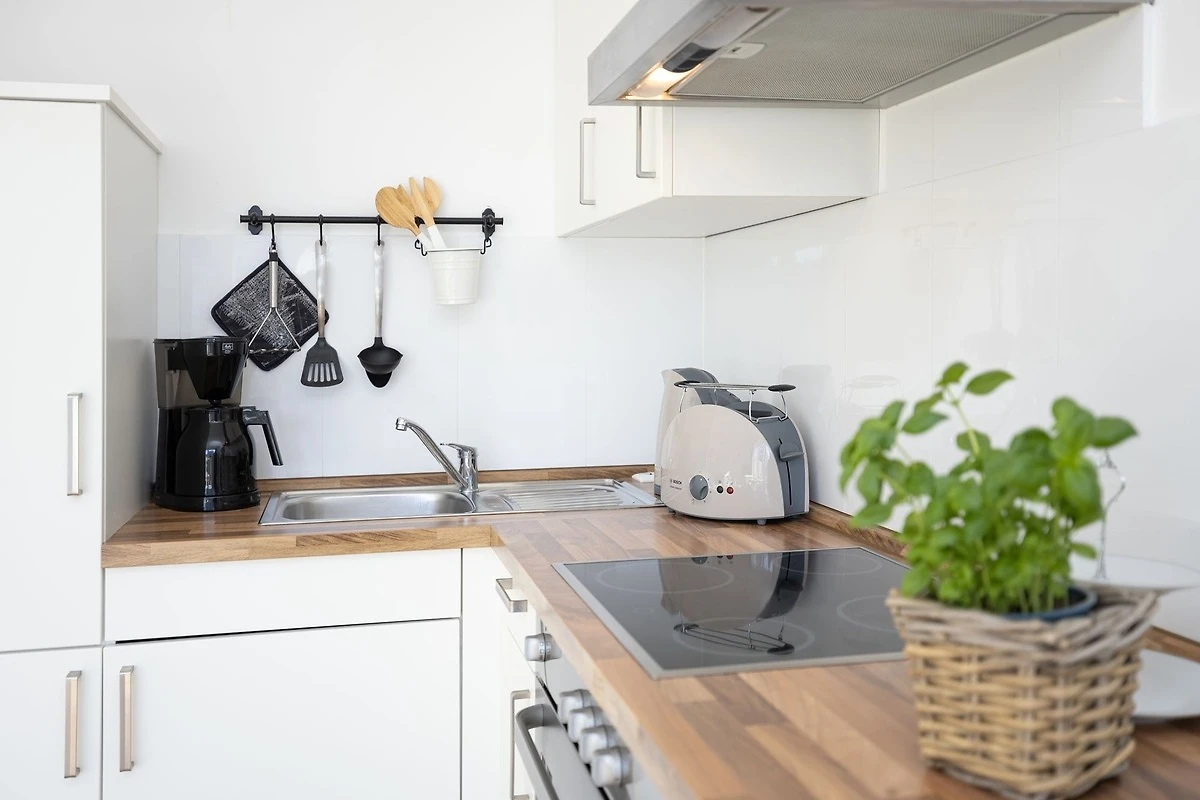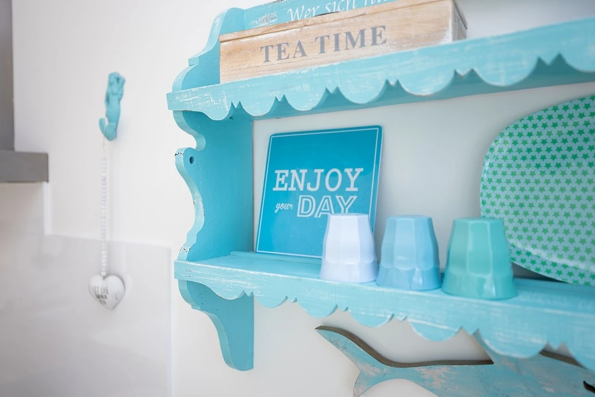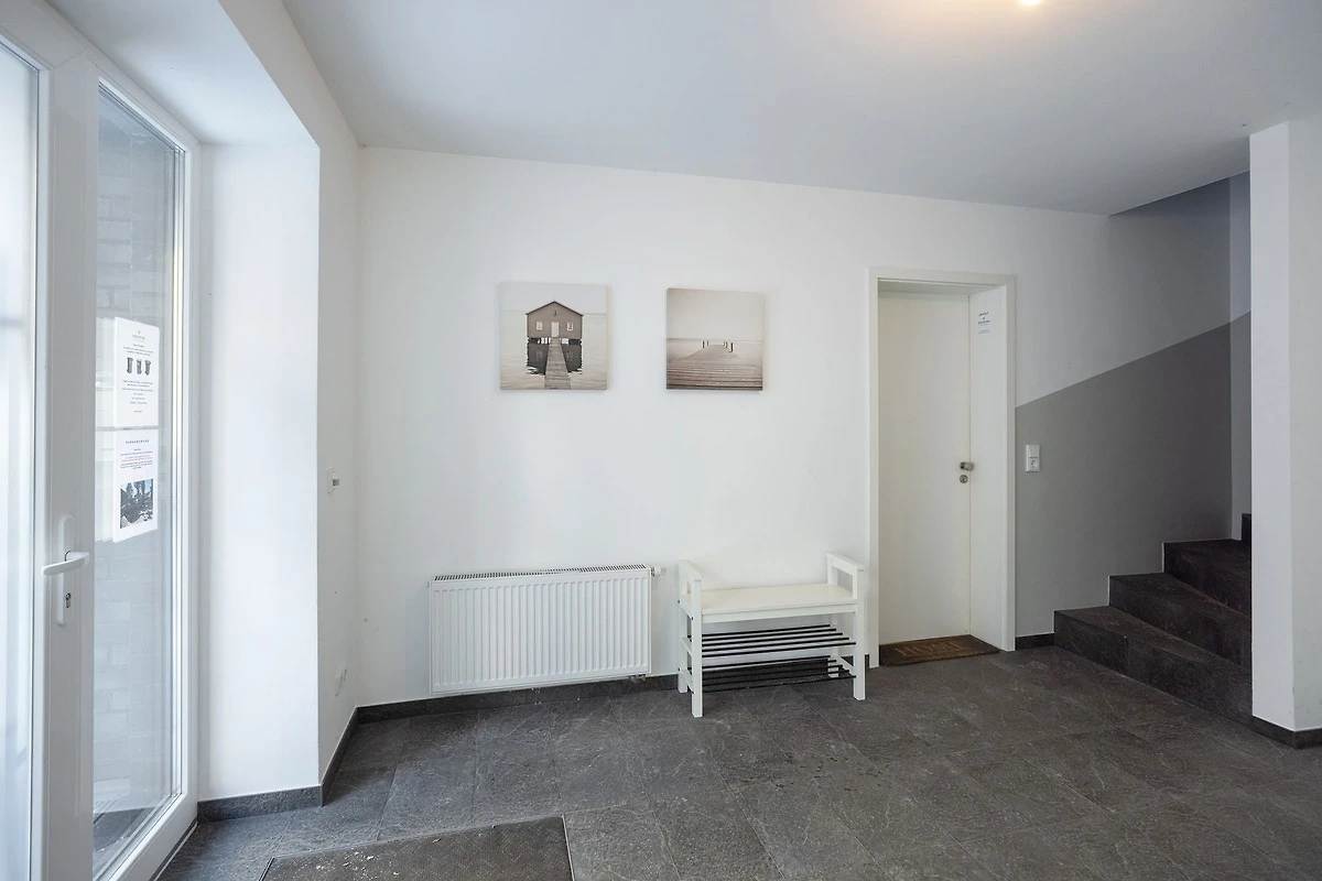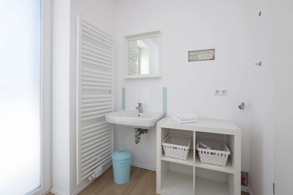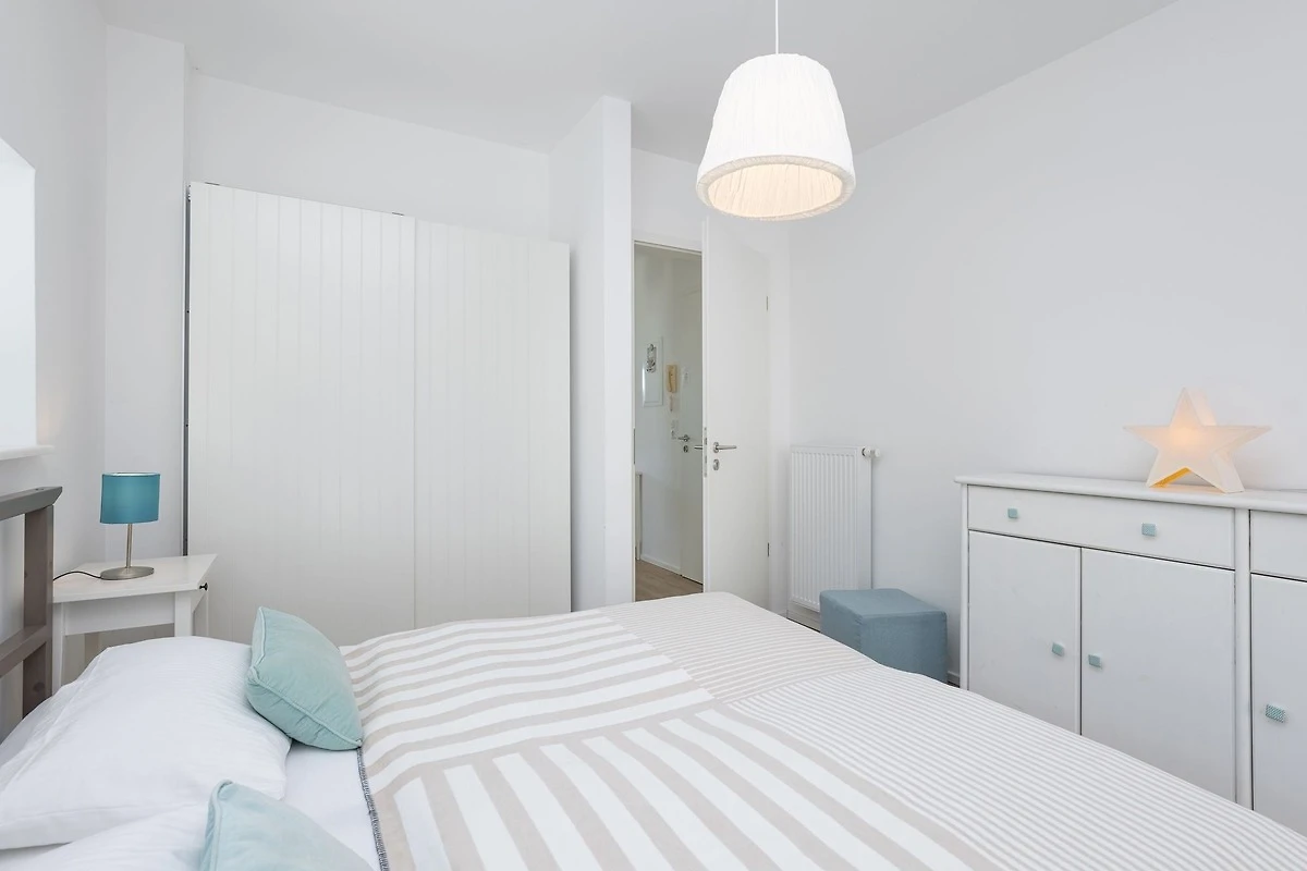 Schliessen Sie auf und treten Sie ein! Ein heller Flur mit Garderobe empfängt Sie. Gleich geradezu das Wohnzimmer mit Essplatz und offener bestens ausgestatteter Küchenzeile strahlt mit seinen nordischen Farbtönen und geschmackvollen Details. Öffnen Sie die Terrassentür und denken Sie schon mal an das Frühstück, das Sie draussen in aller Ruhe geniessen können oder zwischendurch ein Buch im Strandkorb lesen. Herrlich entspannen können Sie auf der gemütlichen Sofaecke und dabei einen guten Film ansehen oder Ihren Freunden zu Hause ein paar Urlaubsbilder senden. Im Handumdrehen können Sie das Sofa zu einem Schlafplatz herrichten, Verdunkelungsgardinen an den bodentiefen Fenstern sorgen für eine angenehme Nachtruhe. Am anderen Flurende ist das Schlafzimmer mit Doppelbett (2x 80x200 cm) und einem Kleiderschrank. Verdunkelungsplissees sind hier am Fenster angebracht. Daneben ist das tageslichthelle Duschbad mit ebenerdiger Dusche, Handtuchwärmer und Föhn.