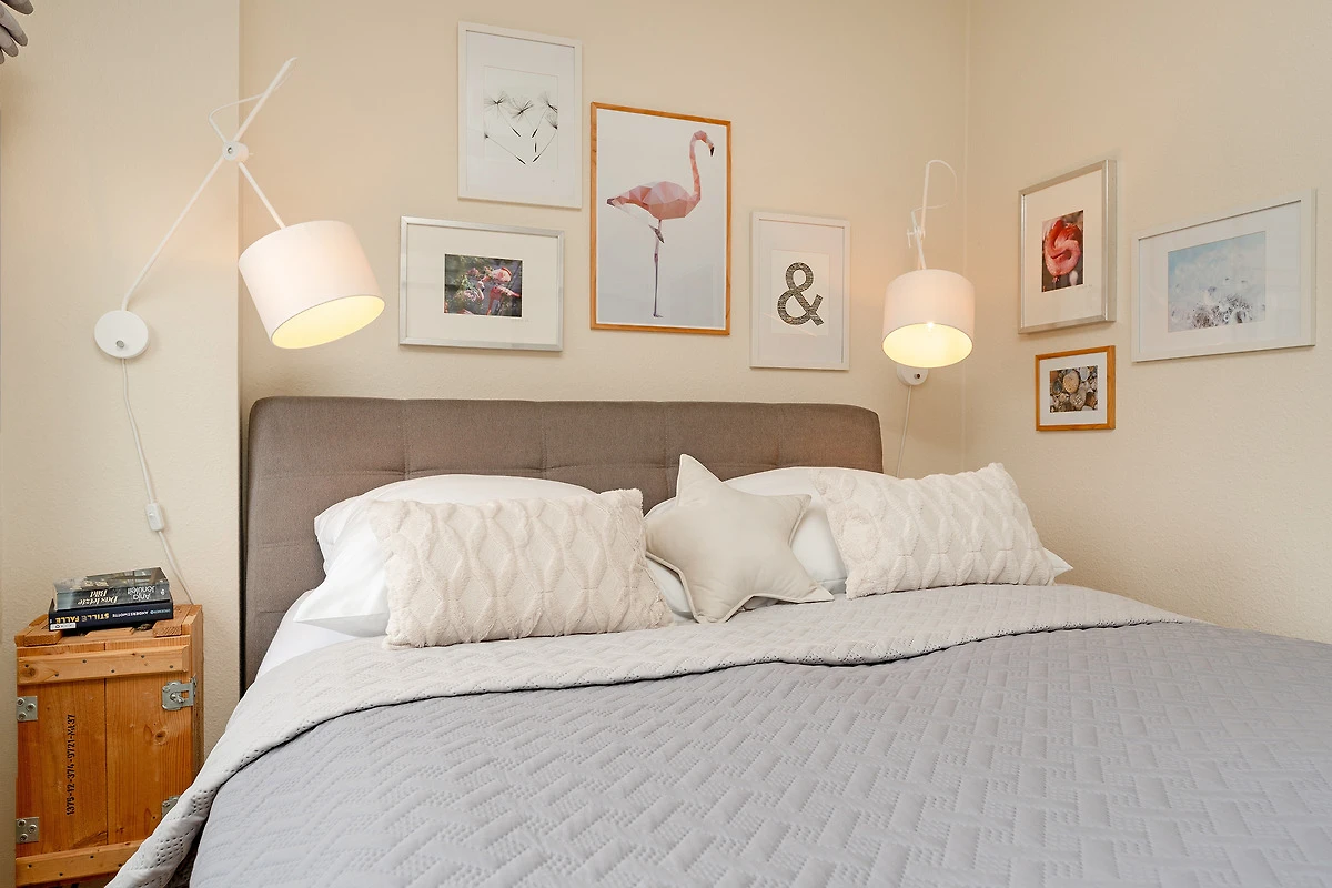 Es ist modern und geschmackvoll eingerichtet. Es gibt einen Schlafraum mit einem Doppelbett (180x200 cm) und Kleiderschrank, ein helles Duschbad und ein Gäste-WC. Im Wohnraum befinden sich eine Couchgarnitur, welche zu einem Einzelbett (140x200 cm) ausgezogen werden kann, eine Musikanlage, ein DVD-Player und ein LCD-TV. Starten Sie Ihren Tag mit Kaffee und Brötchen auf dem gemütlichen Balkon mit sonniger Süd-Ausrichtung. Die offene Küchenzeile ist ausgestattet mit Kühlschrank mit Gefrierfach, 2-Plattenherd, Mikrowelle, Geschirrspüler, Kaffeemaschine, Wasserkocher und Toaster. Am grossen Esstisch ist Platz für bis zu 4 Personen. Hier können Sie den Abend gesellig ausklingen lassen.