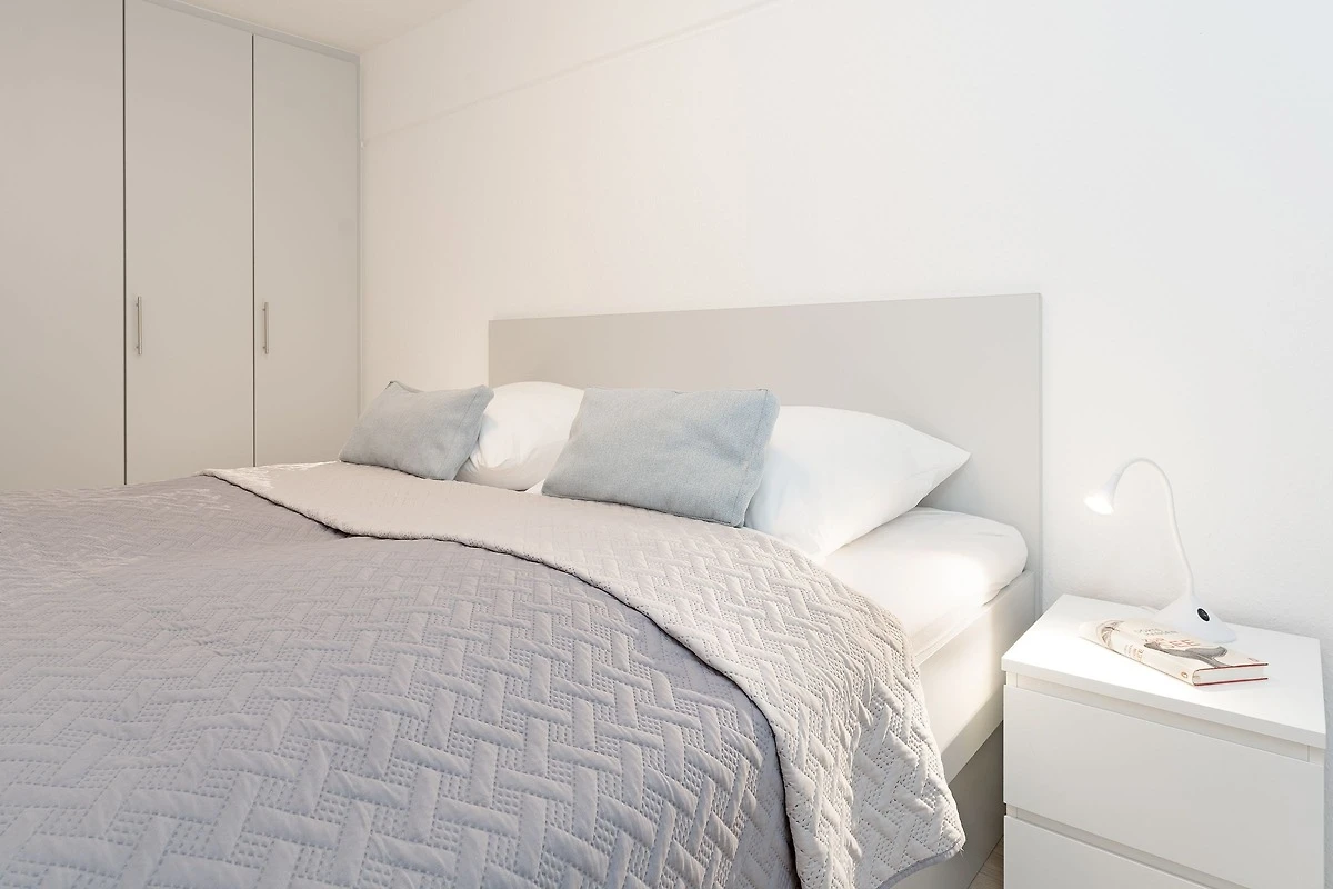 Der offene Wohn-/Schlafbereich empfängt Sie lichtdurchflutet und mit geschmackvollem Interieur. Ein hochwertiges Schrankbett bietet hier eine bequeme Schlafmöglichkeit für bis zu 2 Personen (2x 70x200 cm). Ein komfortabler Lounge Bereich mit Sofas, Sesseln, Flachbild-TV und Bose System mit USB-Anschluss sorgt nach langen Strandtagen für geruhsame Stunden. Der angrenzende Essbereich ist für bis zu 4 Personen ausgerichtet und bietet Platz für gesellige Mahlzeiten, auch die moderne und hochwertige Küchenzeile ist clever in den Wohnraum integriert. Ein direkter Zugang führt vom Wohnzimmer auf den möblierten Balkon mit spektakulärem Meerblick! Atemberaubend! Eins der zwei Schlafzimmer verfügt über ein Doppelbett (2x 100x190 cm), sowie einen geräumigen Kleiderschrank mit reichlich Stauraum für Ihre Urlaubsgarderobe. Das zweite Schlafzimmer bietet mit einem Einzelbett (80x200 cm) und Regalschränkchen einen lauschigen Rückzugsort für eine weitere Person. Das hell geflieste Bad ist mit Dusche, WC, Waschtisch und beleuchtetem Spiegel ausgestattet.