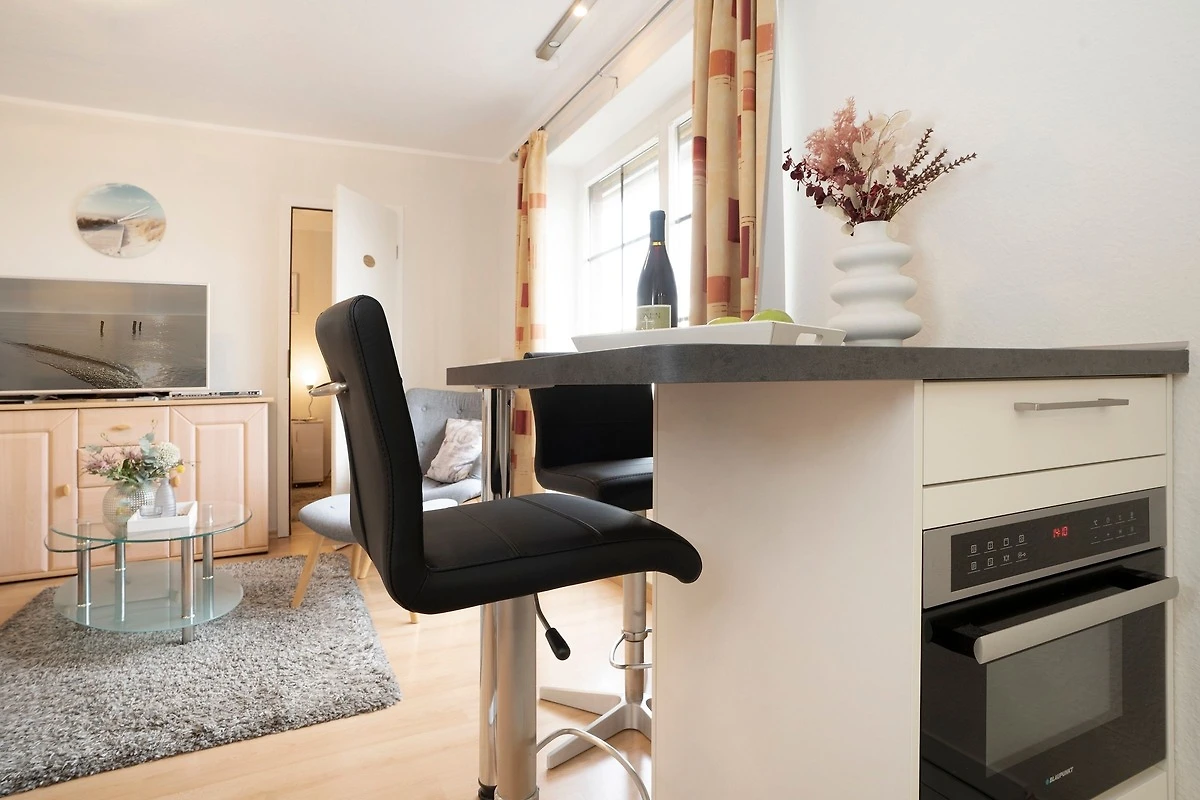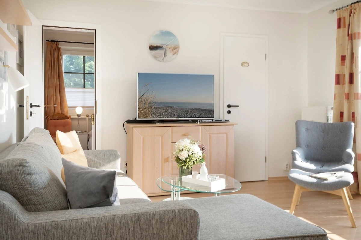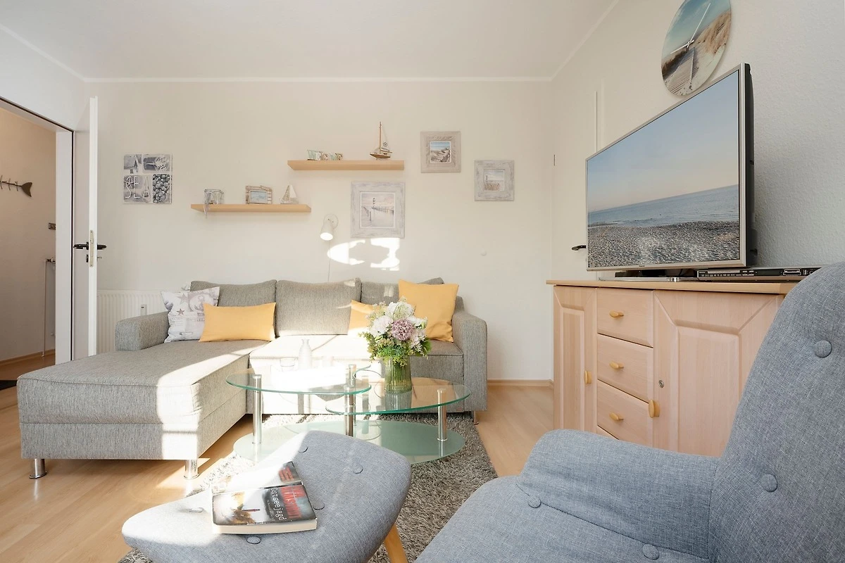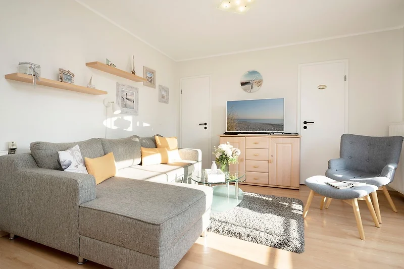 Es verfügt über einen stilsicher eingerichteten Wohnraum mit einem hochwertigen Ecksofa mit Schlaffunktion, sowie integriertem Essplatz und angrenzender, gut ausgestatteter Küche mit praktischen Annehmlichkeiten wie Spülmaschine, Mikrowelle mit Grillfunktion, Backofen und Kaffeemaschine für den frischen Kaffee am Morgen. Für Unterhaltung sorgen ein neuer Flachbildfernseher, ein DVD-Player, eine Stereo-Anlage, sowie ein kostenloser WLAN-Zugang. Noch dazu führt ein direkter Zugang vom Wohnzimmer auf den möblierten Balkon - von hier aus hören Sie die Wellen rauschen, pures Ostseegefühl. Das separate Schlafzimmer ist mit einem Doppelbett (160x200 cm), einem geräumigen Kleiderschrank und einem 2. neuwertigen TV ausgestattet. Im hellen und grosszügigen Badezimmer ist durch Annehmlichkeiten wie einer Eckdusche, Waschtisch und WC für Komfort gesorgt. Das gesamte Interieur ist nordisch frisch und gemütlich - ein herrliches Feriendomizil!