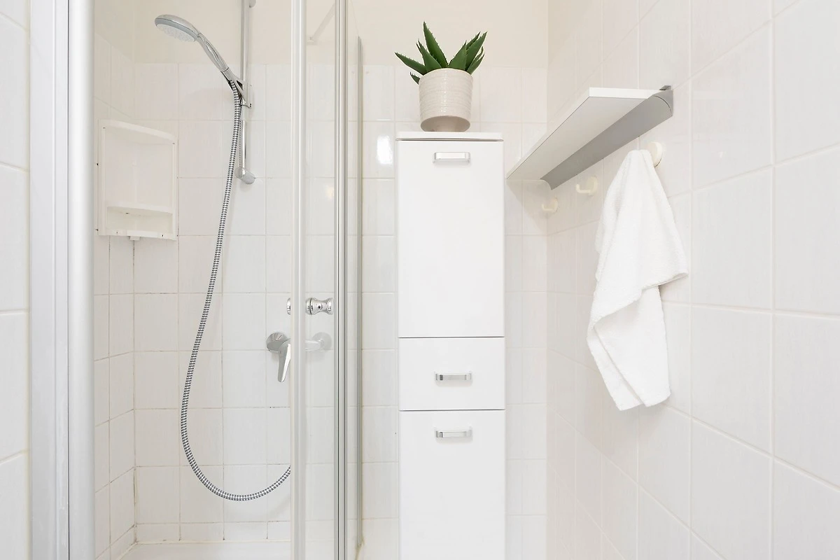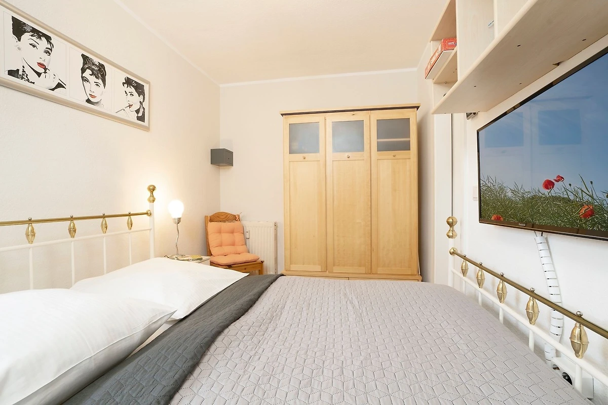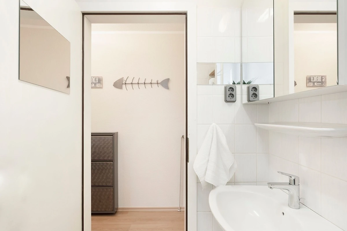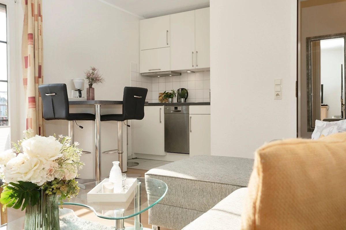 Es verfügt über einen stilsicher eingerichteten Wohnraum mit einem hochwertigen Ecksofa mit Schlaffunktion, sowie integriertem Essplatz und angrenzender, gut ausgestatteter Küche mit praktischen Annehmlichkeiten wie Spülmaschine, Mikrowelle mit Grillfunktion, Backofen und Kaffeemaschine für den frischen Kaffee am Morgen. Für Unterhaltung sorgen ein neuer Flachbildfernseher, ein DVD-Player, eine Stereo-Anlage, sowie ein kostenloser WLAN-Zugang. Noch dazu führt ein direkter Zugang vom Wohnzimmer auf den möblierten Balkon - von hier aus hören Sie die Wellen rauschen, pures Ostseegefühl. Das separate Schlafzimmer ist mit einem Doppelbett (160x200 cm), einem geräumigen Kleiderschrank und einem 2. neuwertigen TV ausgestattet. Im hellen und grosszügigen Badezimmer ist durch Annehmlichkeiten wie einer Eckdusche, Waschtisch und WC für Komfort gesorgt. Das gesamte Interieur ist nordisch frisch und gemütlich - ein herrliches Feriendomizil!