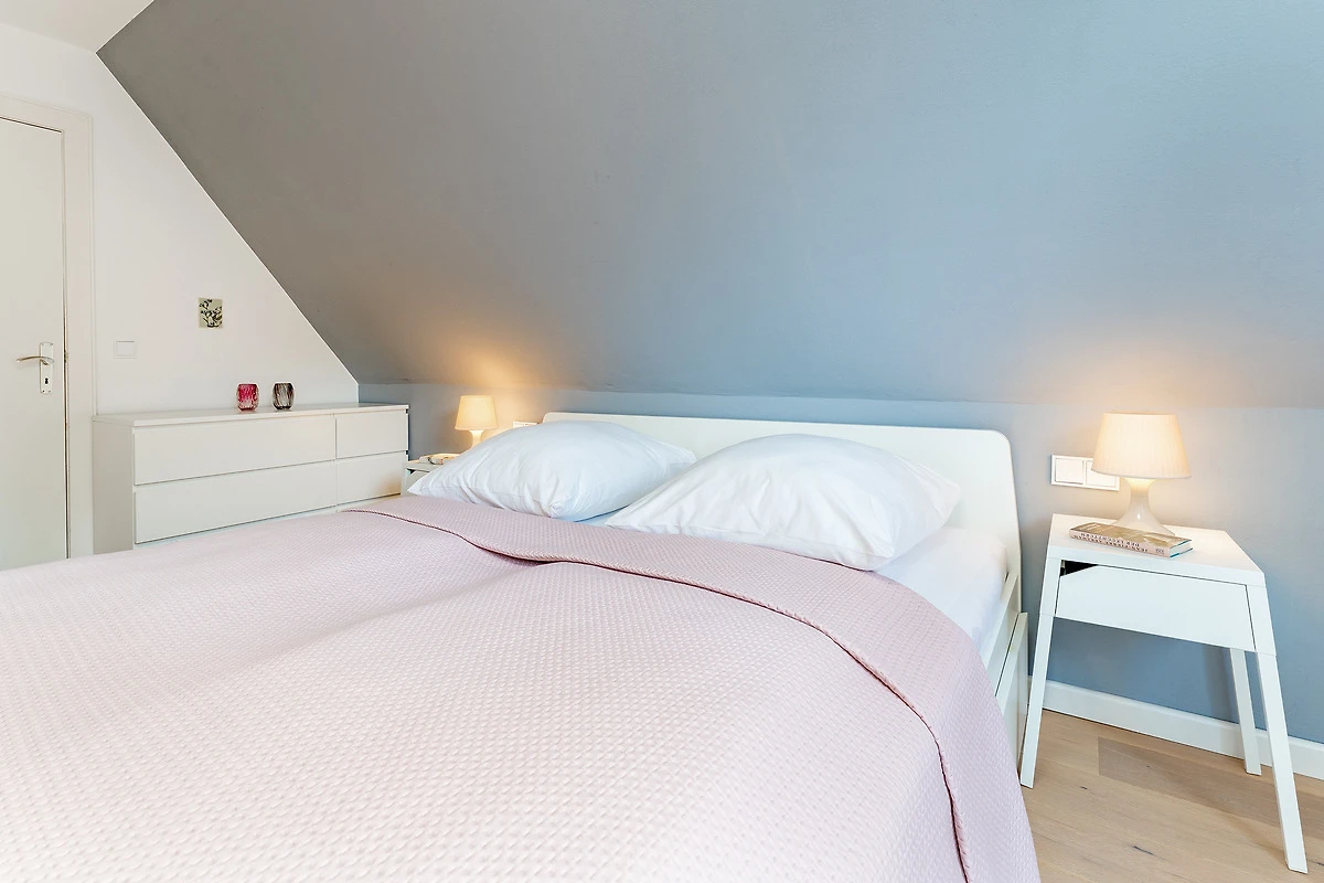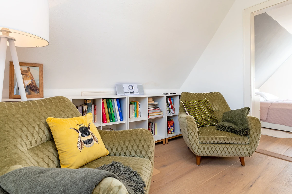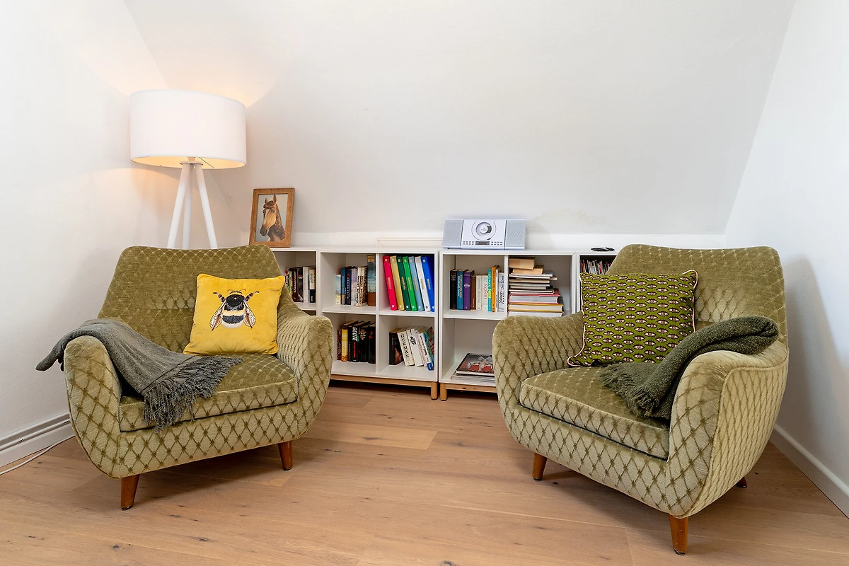 Das tageslichthelle und stilsichere Designbad begeistert mit bodentiefer Dusche, Fussbodenheizung, Waschmaschine, Trockner, beleuchtetem Spiegel und rundum gelungenem Ambiente. Im 1. Obergeschoss befinden sich beide Schlafzimmer: Eines der Schlafzimmer ist mit einem Doppelbett (2x 90x200 cm), Kommode und zwei Nachttischen möbliert, das zweite Schlafzimmer ist mit zwei Einzelbetten (je 80x200 cm), Kommode und TV ausgestattet. Gemütliche Sitzsäcke und eine Sitzecke mit zwei Cocktailsesseln laden im Obergeschoss zum Lümmeln und Entspannen ein. An grauen Tagen vertreiben Sie sich die Zeit mit der grossen Spielesammlung oder schmökern in den vorhandenen Büchern und Zeitschriften.