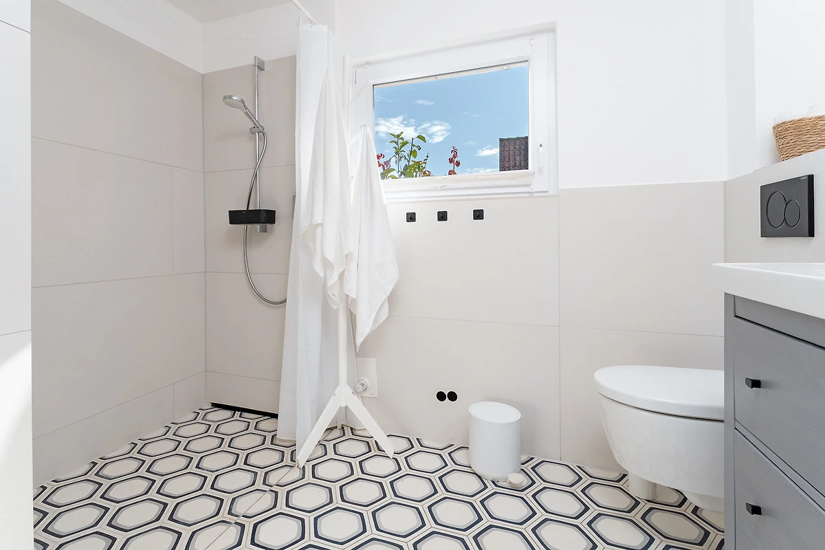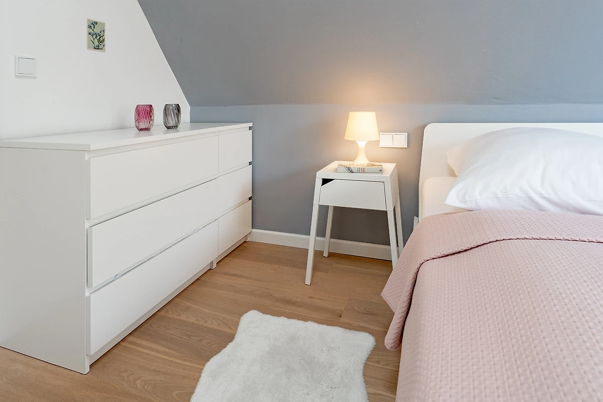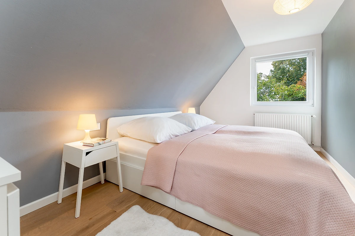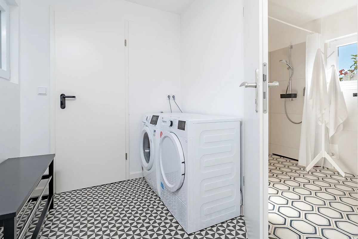 Das tageslichthelle und stilsichere Designbad begeistert mit bodentiefer Dusche, Fussbodenheizung, Waschmaschine, Trockner, beleuchtetem Spiegel und rundum gelungenem Ambiente. Im 1. Obergeschoss befinden sich beide Schlafzimmer: Eines der Schlafzimmer ist mit einem Doppelbett (2x 90x200 cm), Kommode und zwei Nachttischen möbliert, das zweite Schlafzimmer ist mit zwei Einzelbetten (je 80x200 cm), Kommode und TV ausgestattet. Gemütliche Sitzsäcke und eine Sitzecke mit zwei Cocktailsesseln laden im Obergeschoss zum Lümmeln und Entspannen ein. An grauen Tagen vertreiben Sie sich die Zeit mit der grossen Spielesammlung oder schmökern in den vorhandenen Büchern und Zeitschriften.